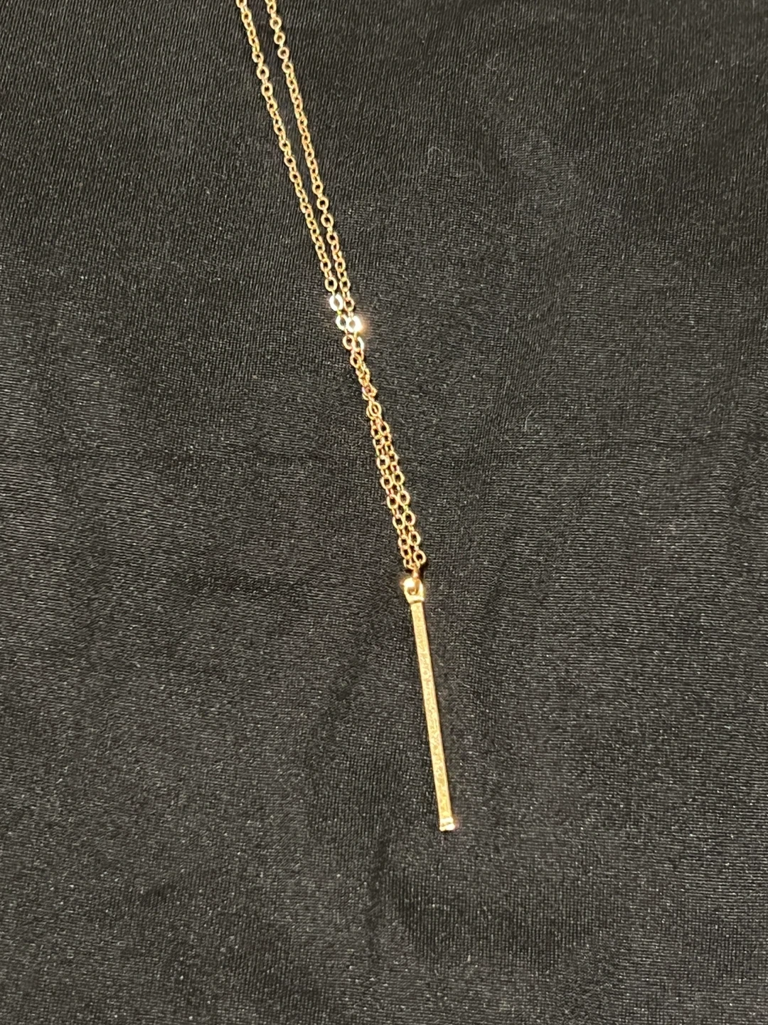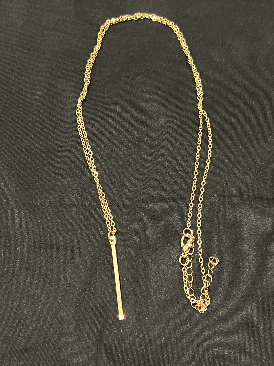 Simple gold tone lariat necklace with a bar pendant. Features a delicate chain and adjustable clasp. A versatile piece for everyday wear!
