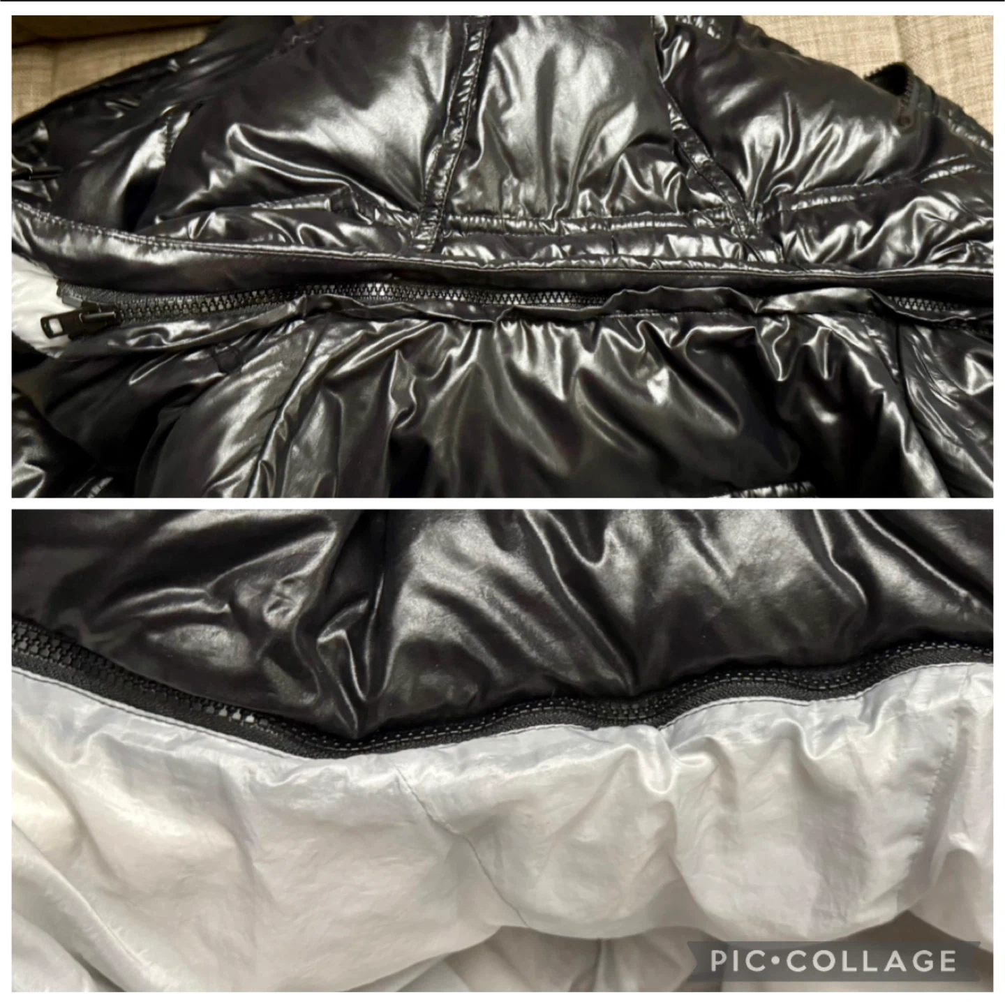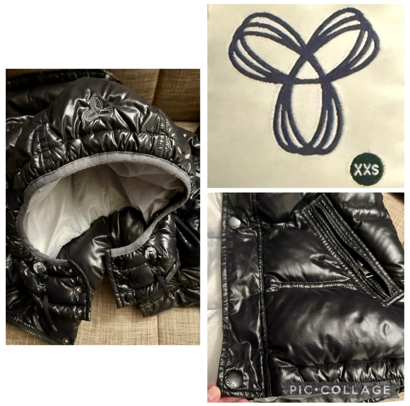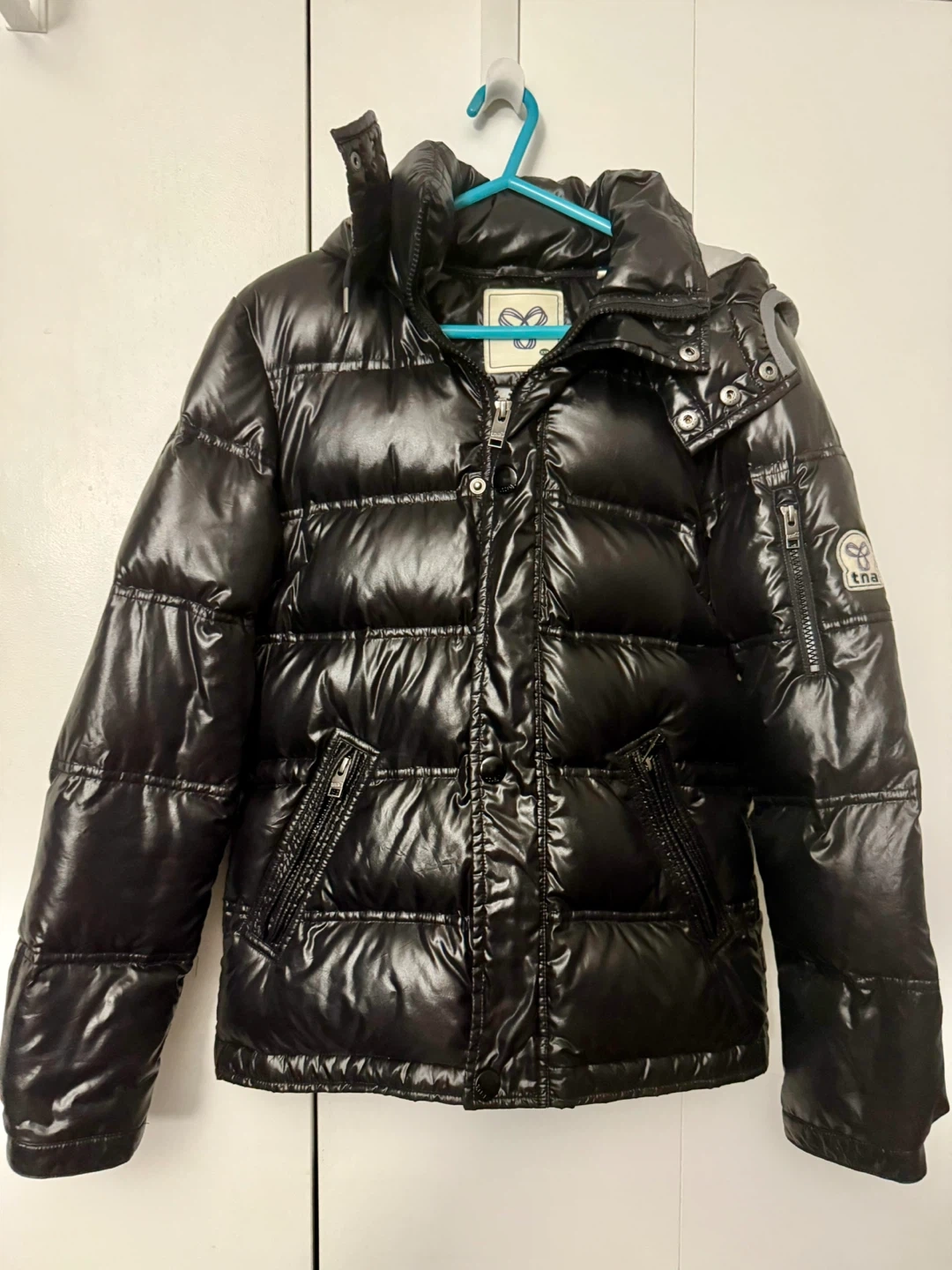 EUC. This is a TNA black shiny puffer jacket. It's a size XXS and has a detachable hooded design. The jacket features zippered pockets and a full front zipper closure.