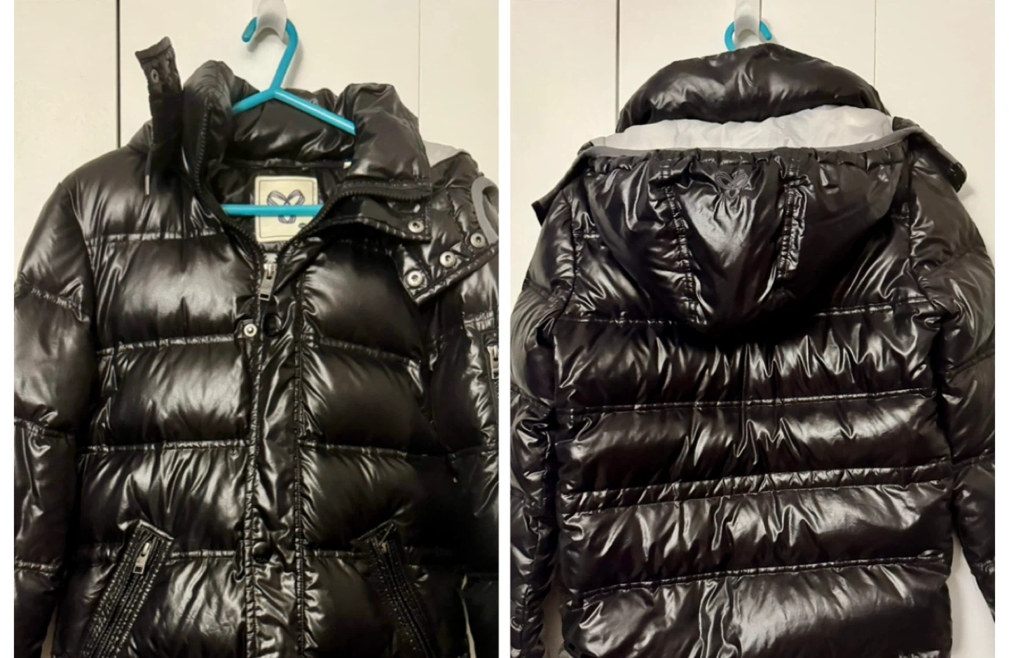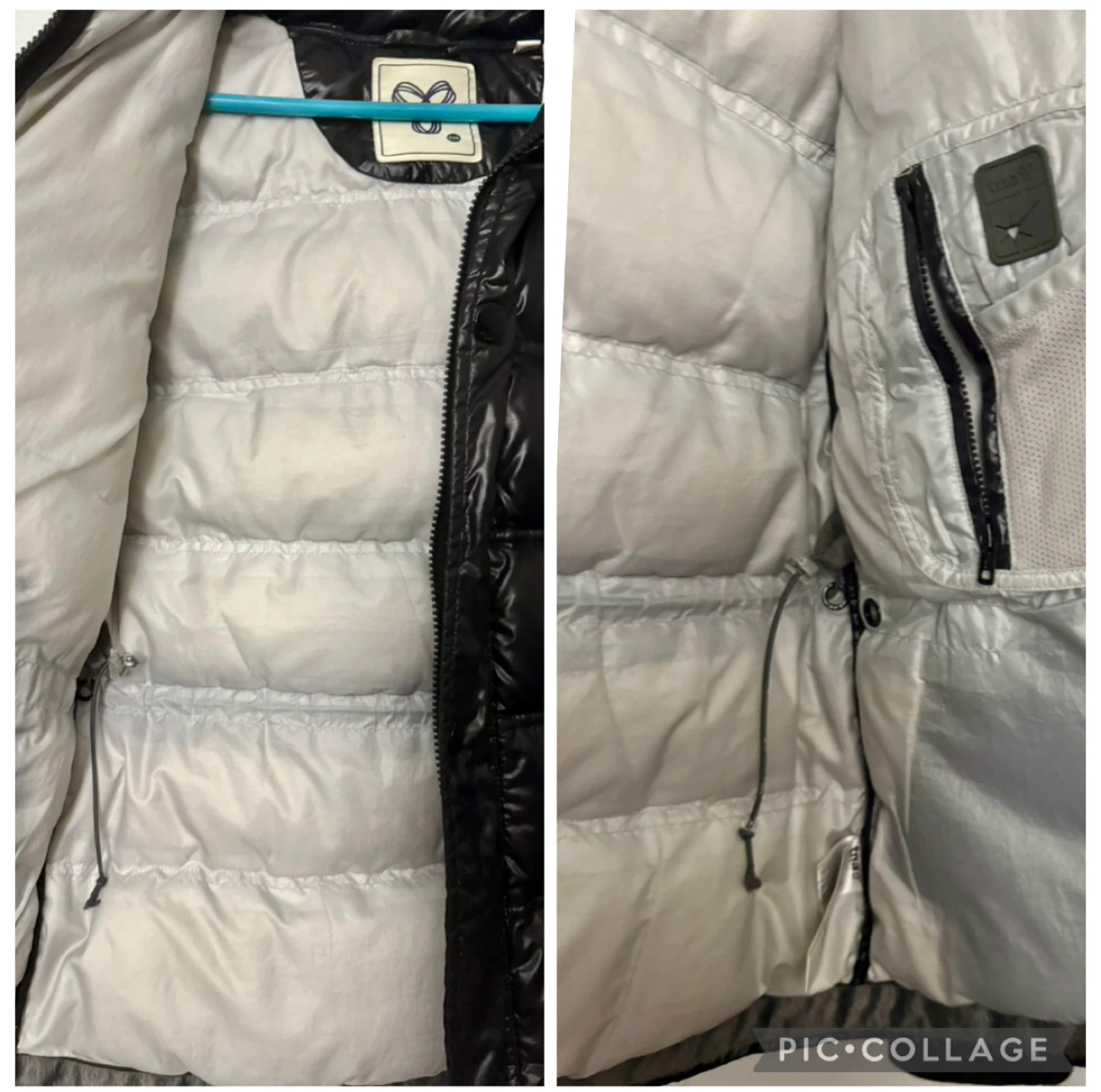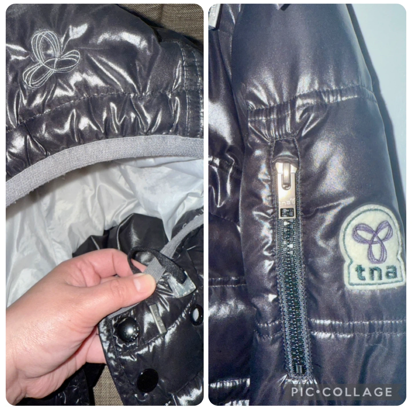 EUC. This is a TNA black shiny puffer jacket. It's a size XXS and has a detachable hooded design. The jacket features zippered pockets and a full front zipper closure.