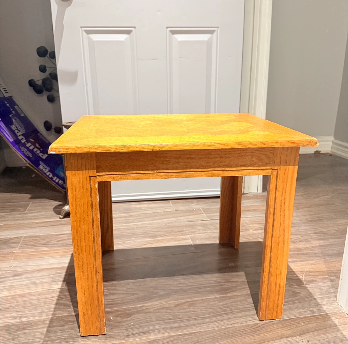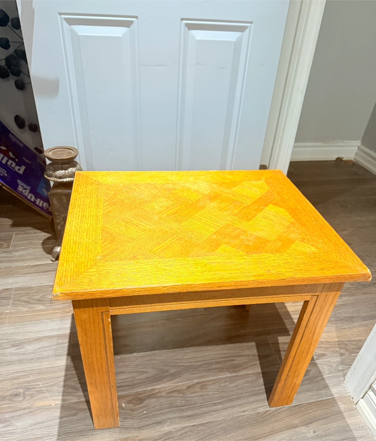 This is a solid wood end table with a classic wood grain inlay on the top. It's a handy size for next to a couch or chair. The light oak finish would fit most decor styles.