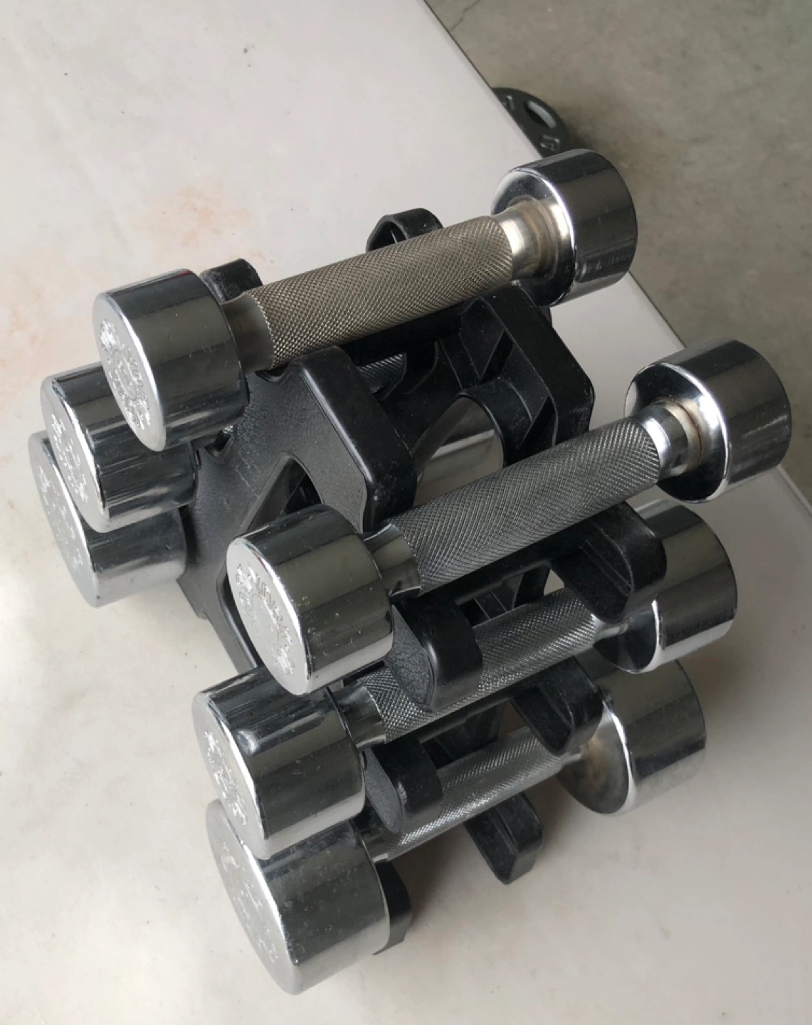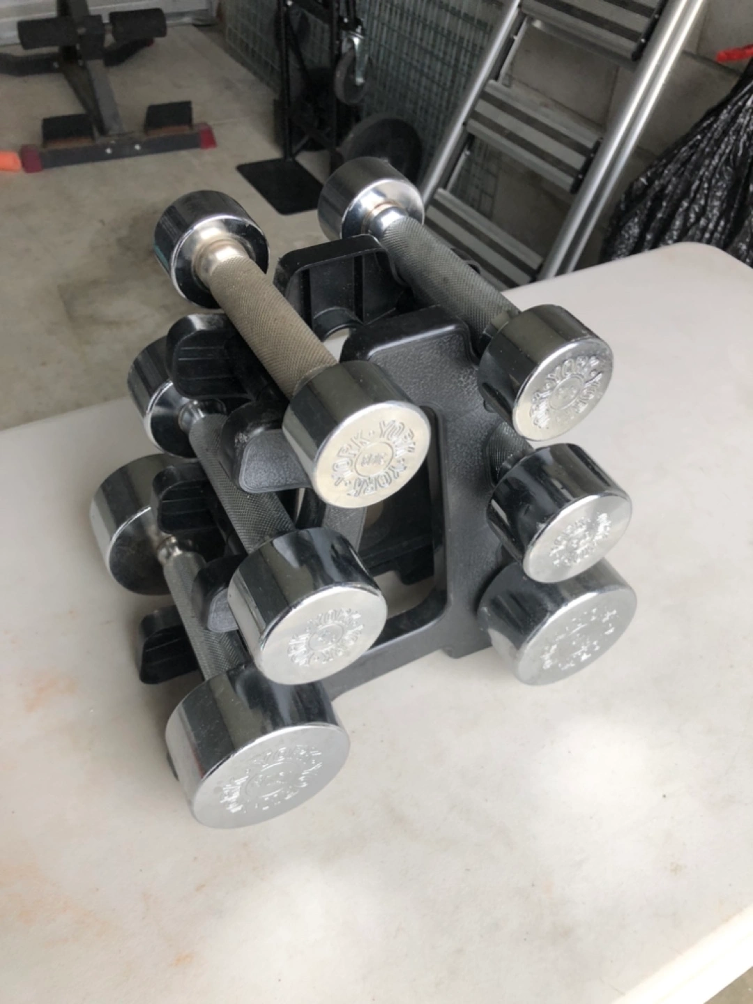 Used Cap Barbell chrome dumbbells. Set includes various weights. Rack included for convenient storage. Great for home workouts.