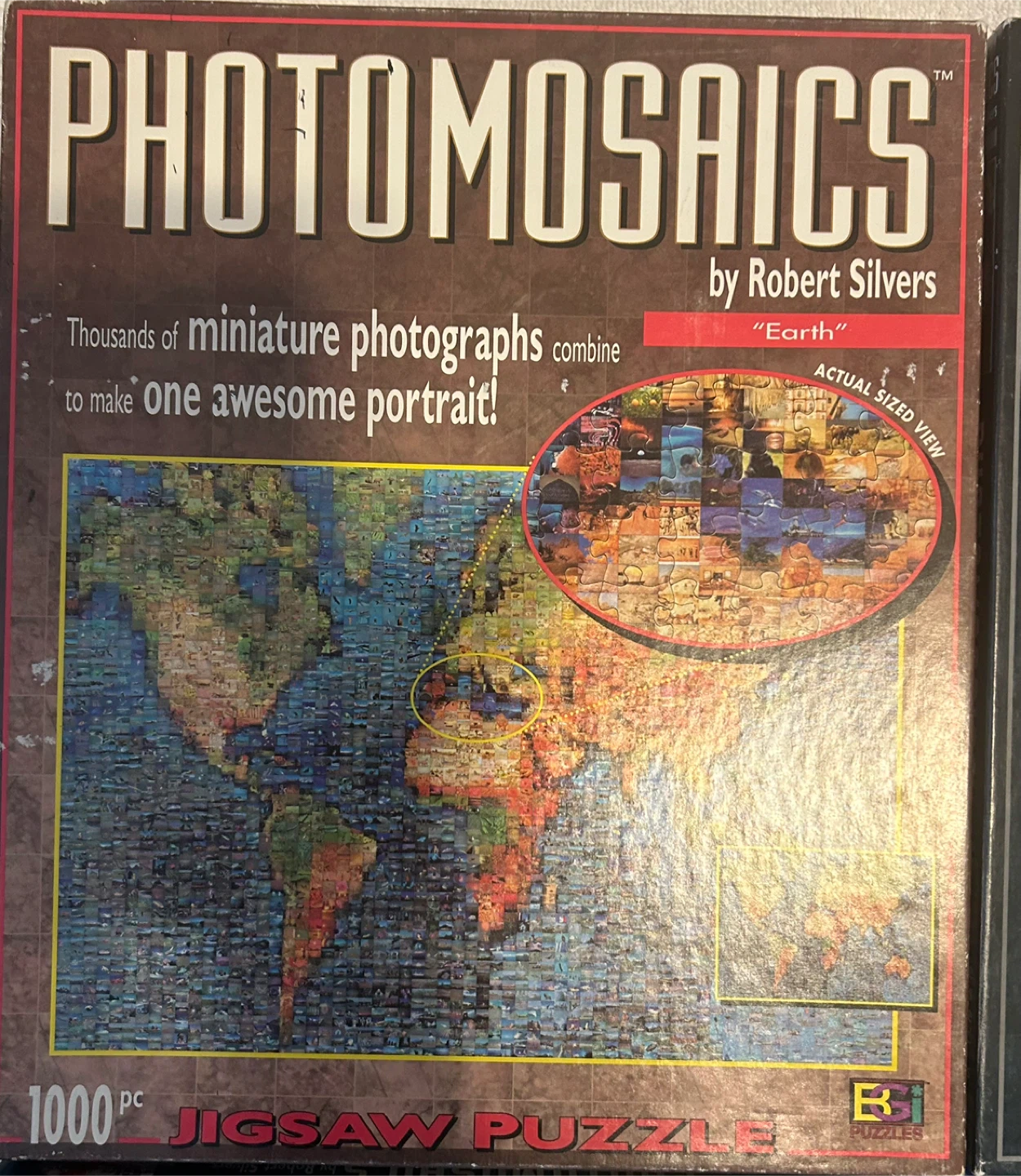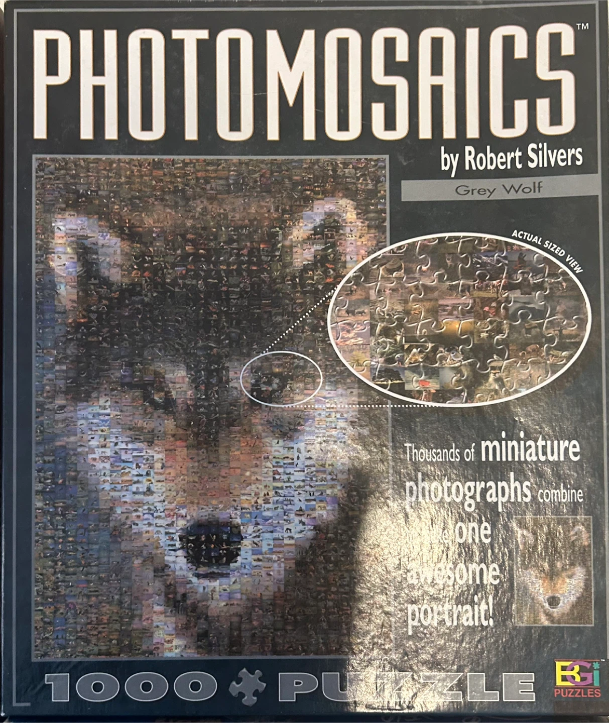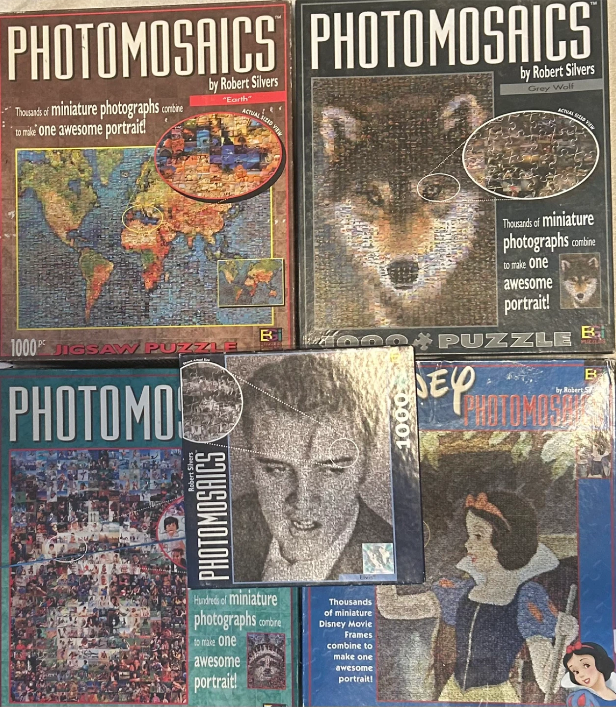 Selling a collection of Photomosaics jigsaw puzzles by Robert Silvers! Each puzzle contains 1000 pieces and features a unique design. Available titles include Earth, Grey Wolf, Liberty, and Disney Movie Frames. Perfect for puzzle enthusiasts!