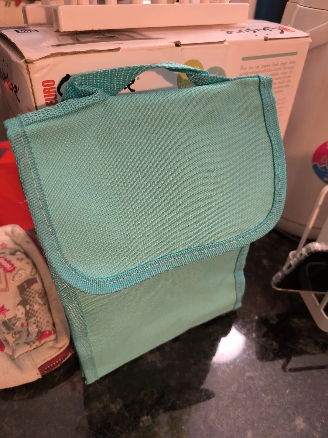 This is a teal-coloured lunch bag with a sturdy handle and a hook-and-loop closure. It's made of durable fabric, perfect for packing your meals. It's a great size for everyday use!