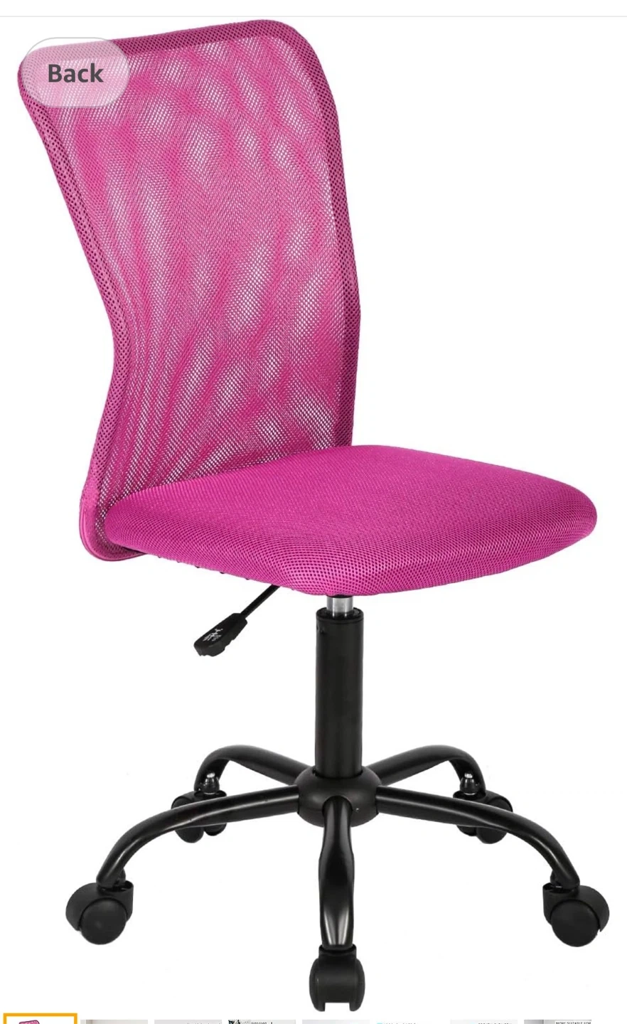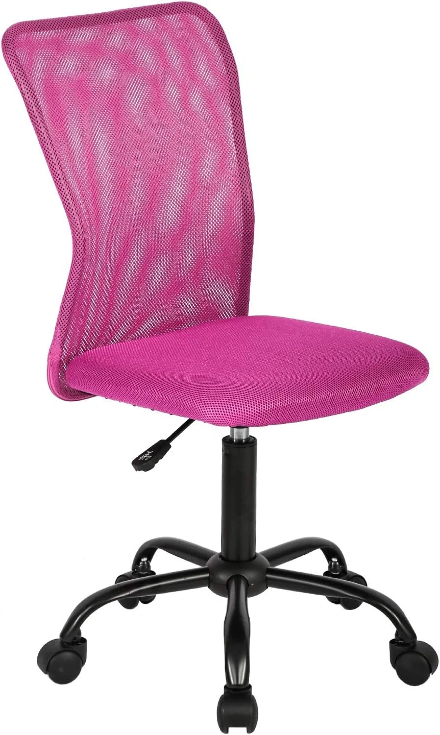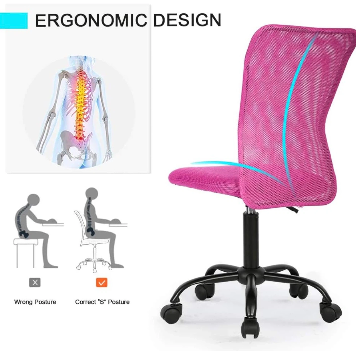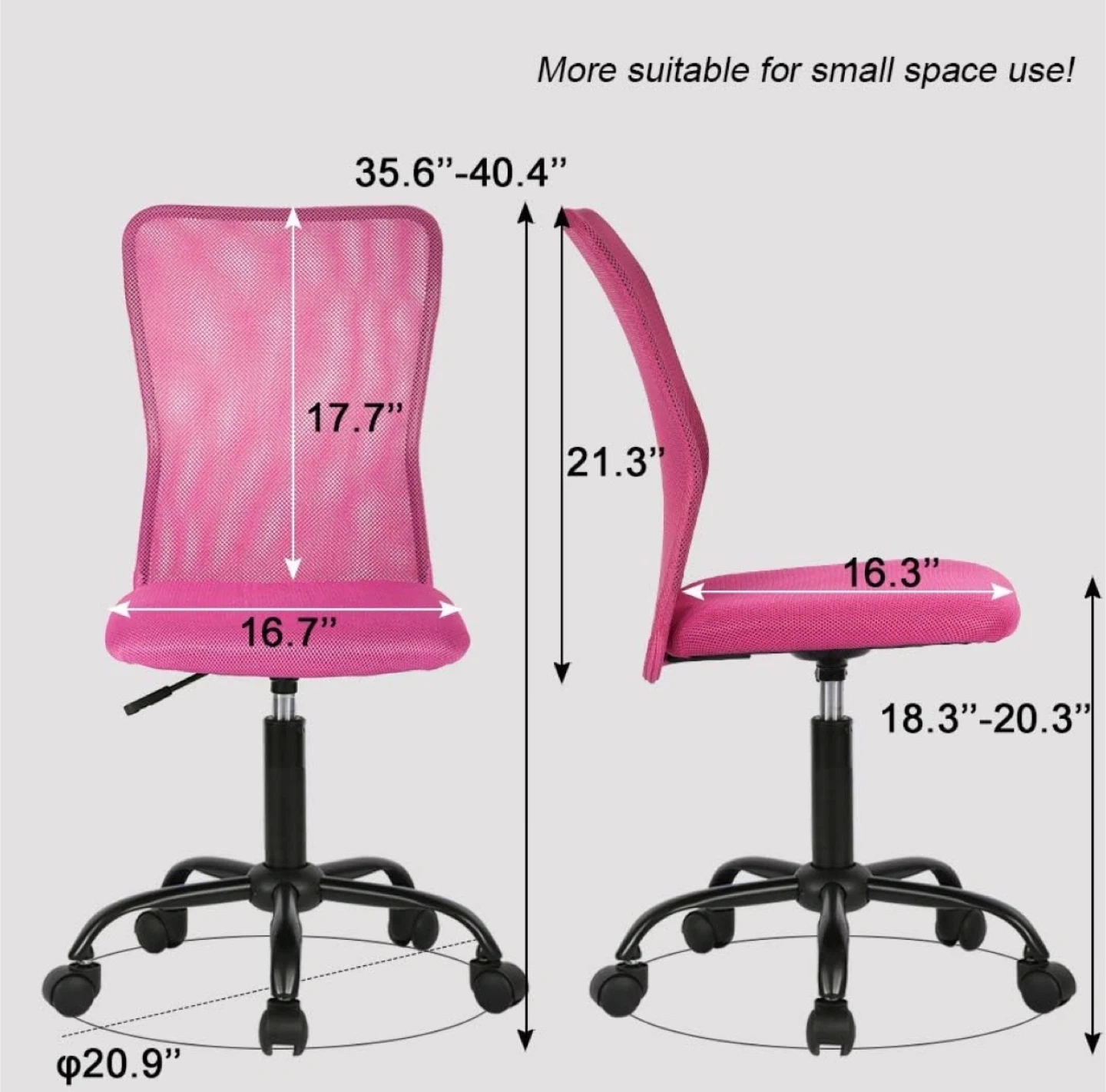 This pink mesh office chair features an ergonomic design. Seat height is adjustable from 18.3" to 20.3". The seat measures 16.7" wide and 16.3" deep, with a backrest height of 17.7".