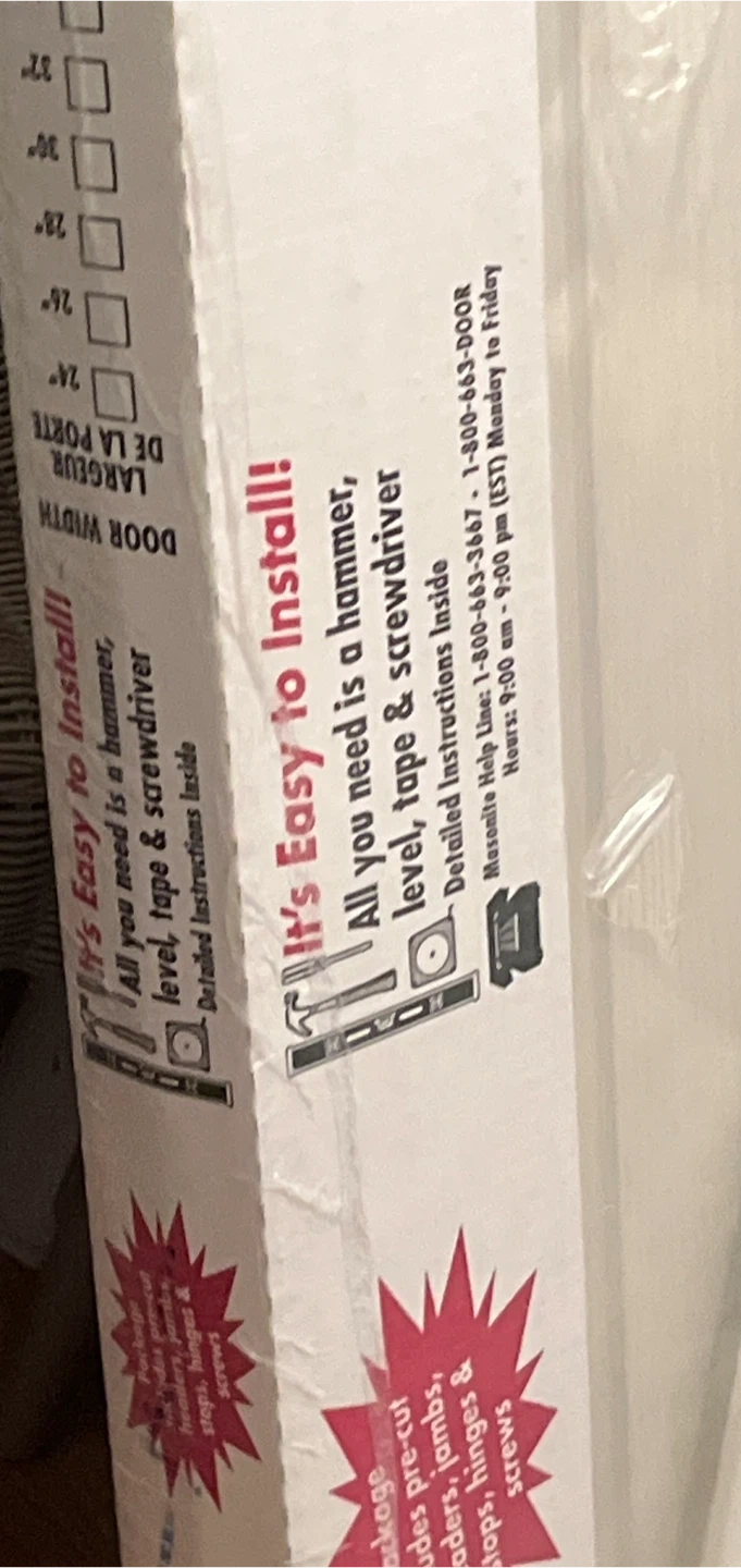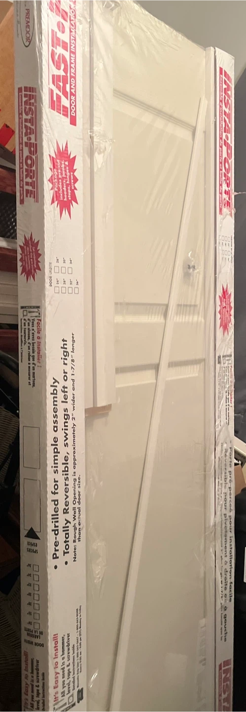 Selling a brand new Easton Insta-Forte door still in its original packaging! It's pre-drilled for simple assembly and can swing left or right. All you need is a hammer, level, tape, and screwdriver to install it. Rough wall opening is approximately 2" wider and 1-7/8" longer than the actual door size