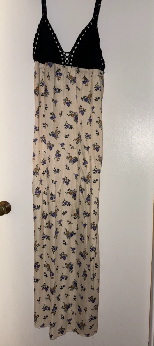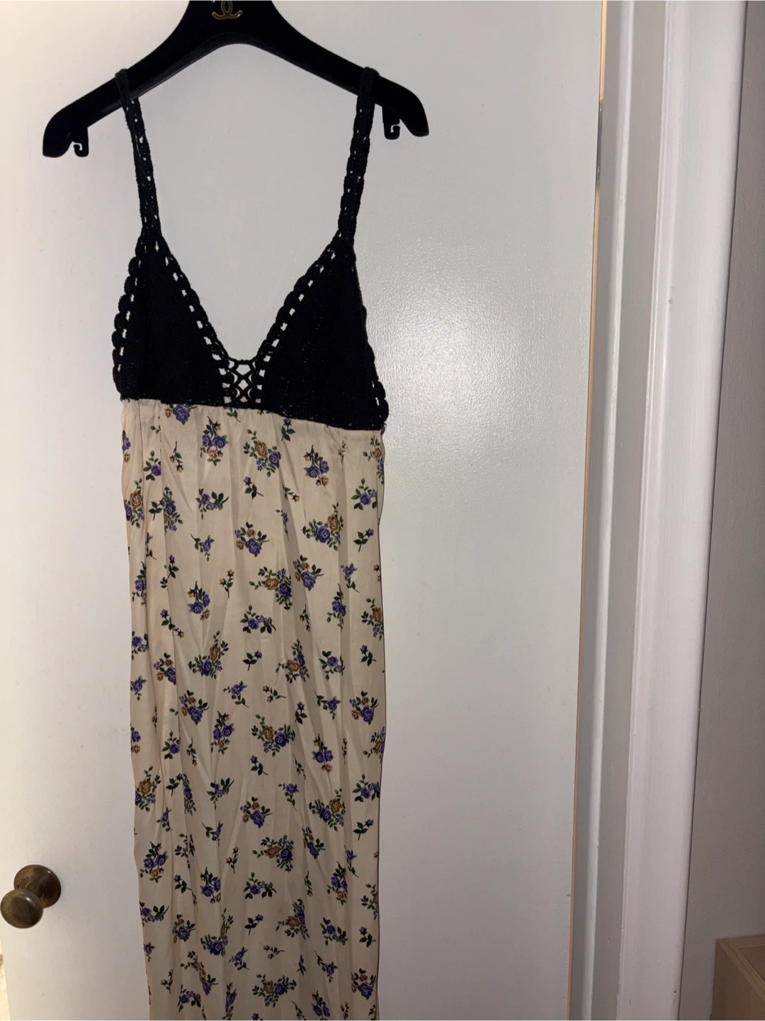 This flowy maxi dress features a black crochet bodice and a cream-coloured skirt with a delicate floral print. It's got adjustable spaghetti straps for a comfortable fit. This dress is perfect for a summer day out or a beach vacation!