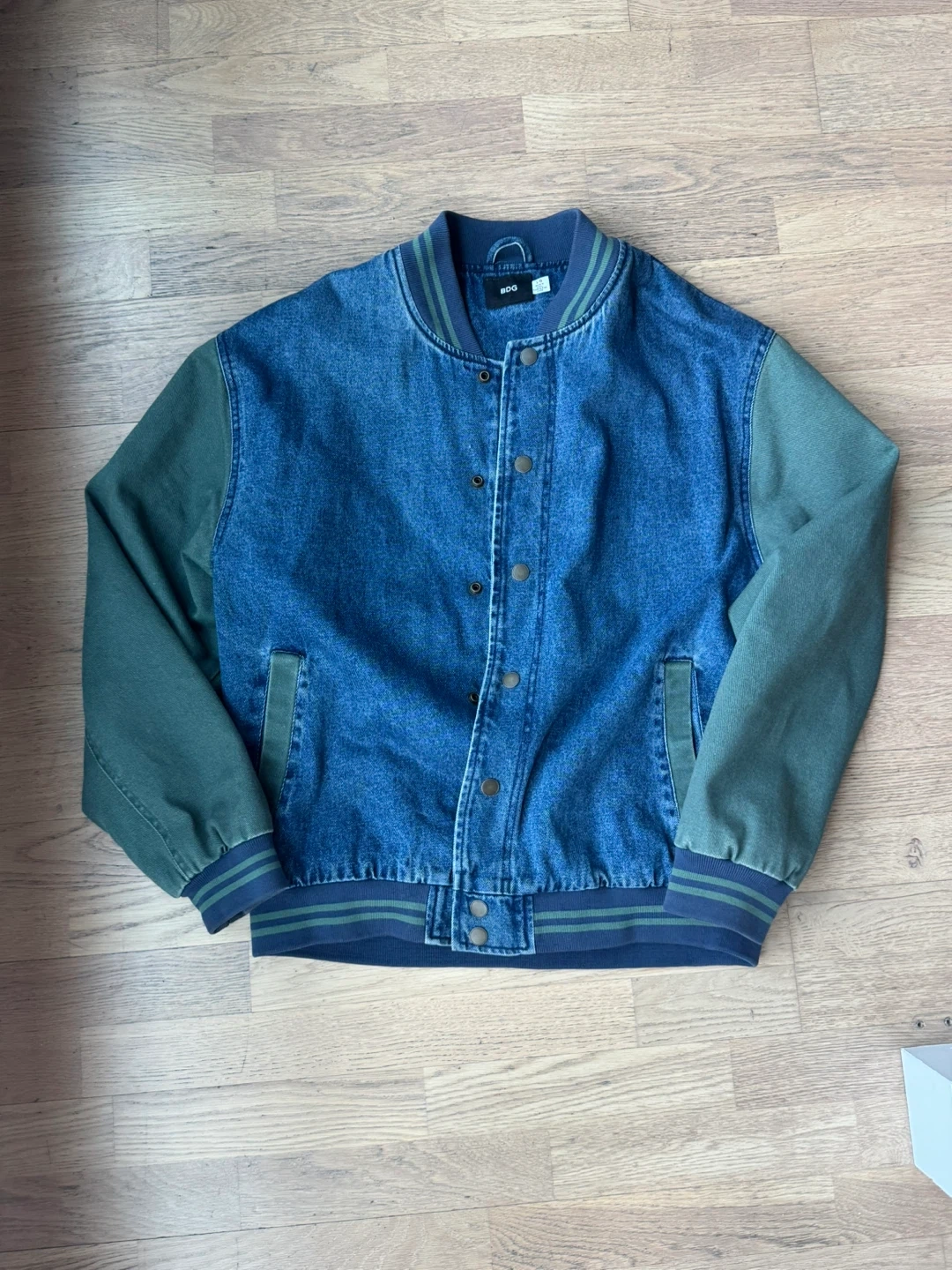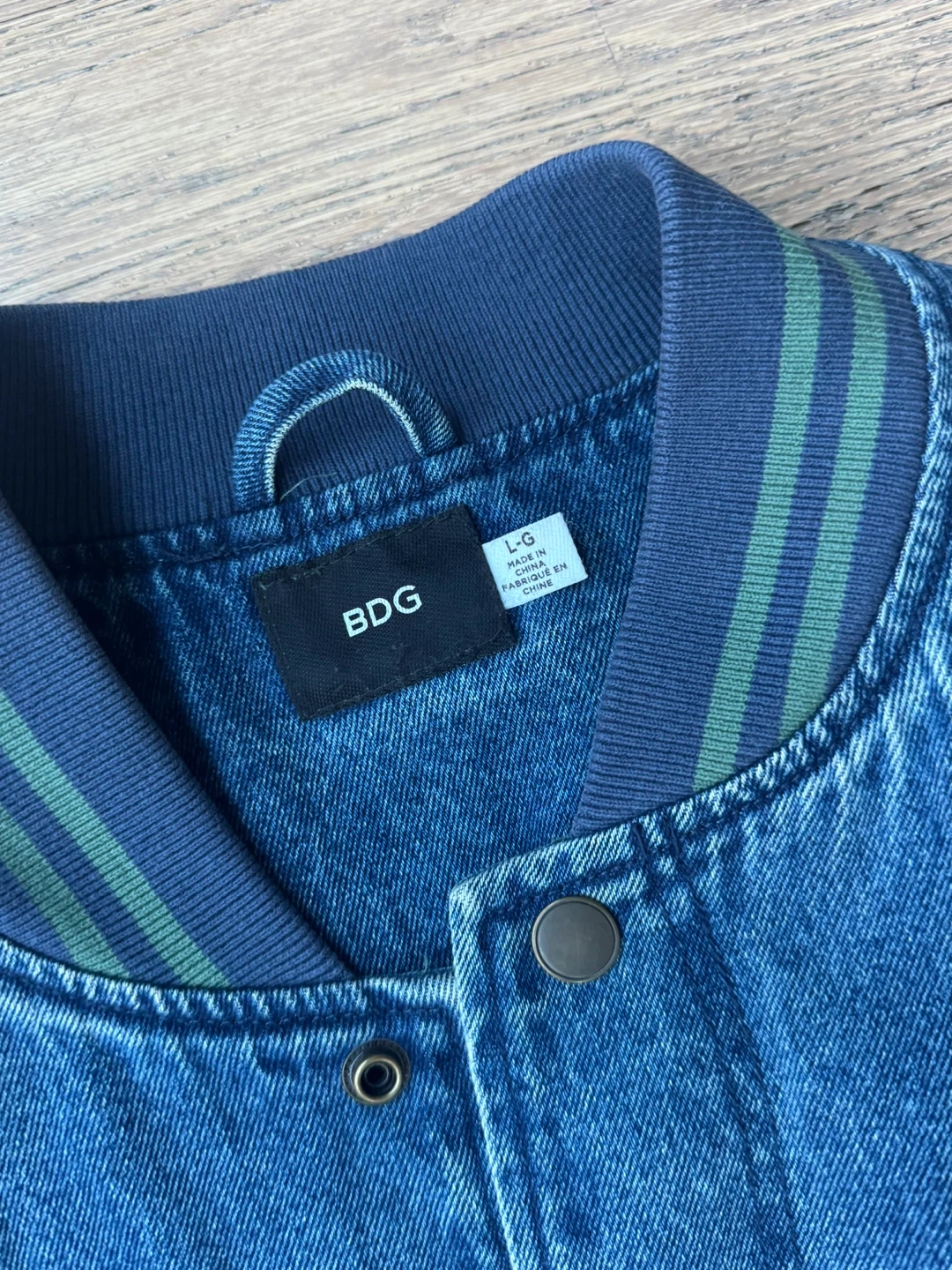 Selling a BDG denim bomber jacket in size large! It's a stylish and comfortable jacket, perfect for layering. The jacket features a classic bomber silhouette with a denim body and contrasting sleeves. It's in great condition and ready for a new home!