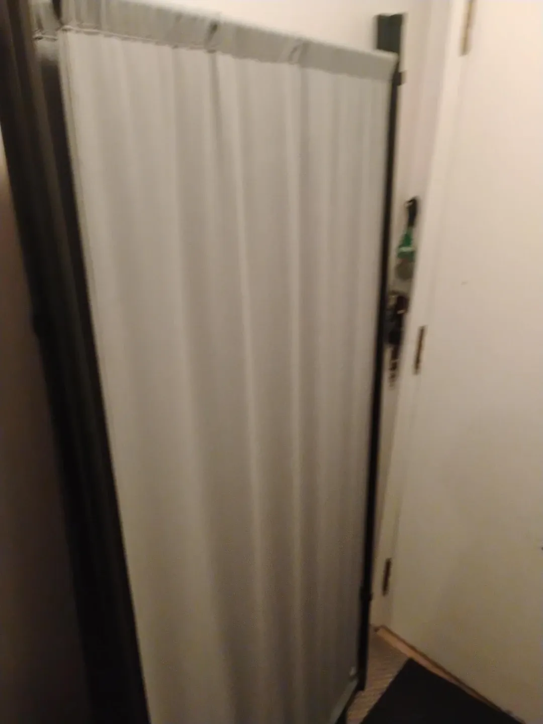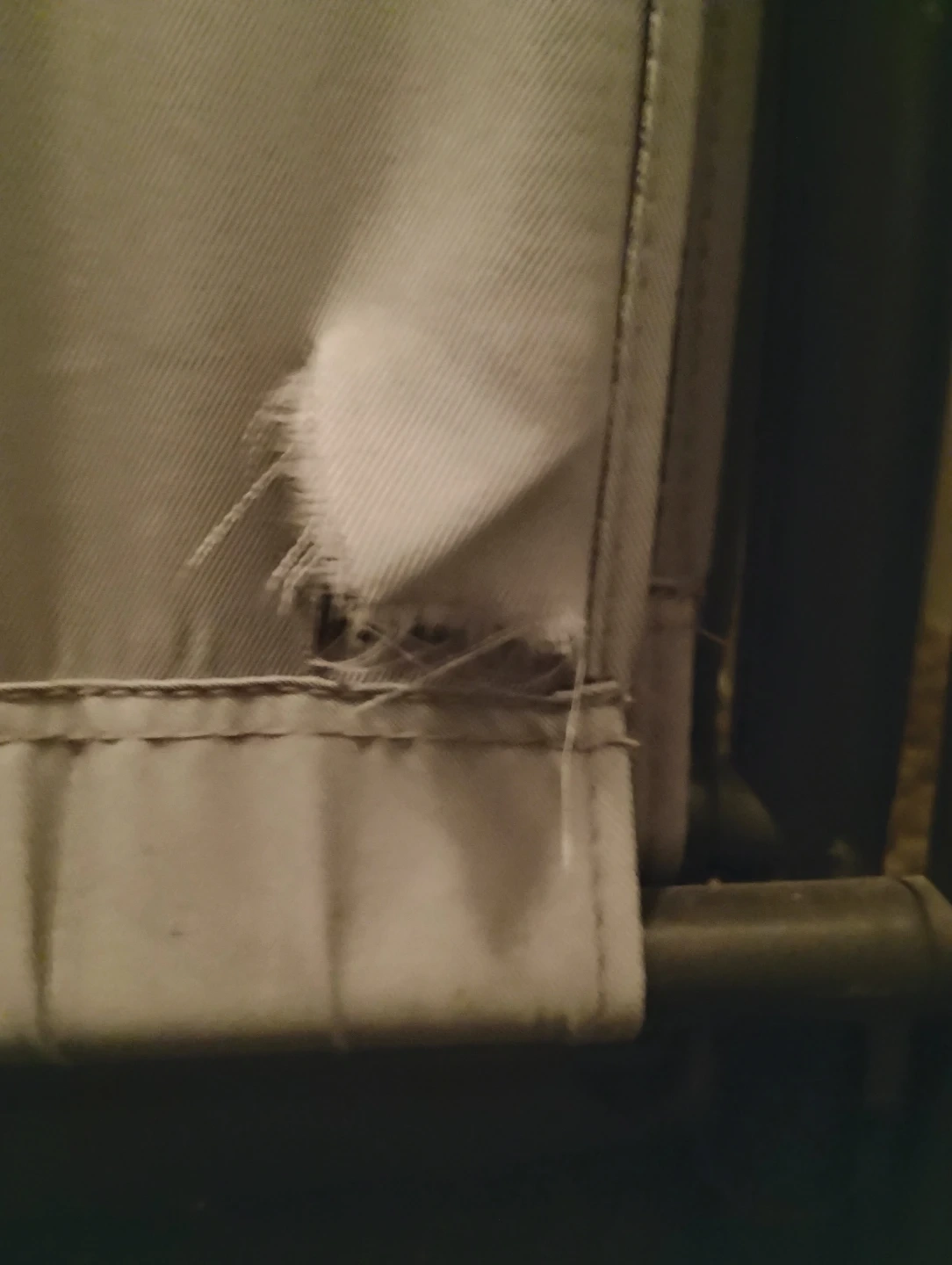 This is a fabric room divider panel. It's made of a light grey material. There's a tear on the bottom right corner of the fabric on one panel, otherwise in good condition.