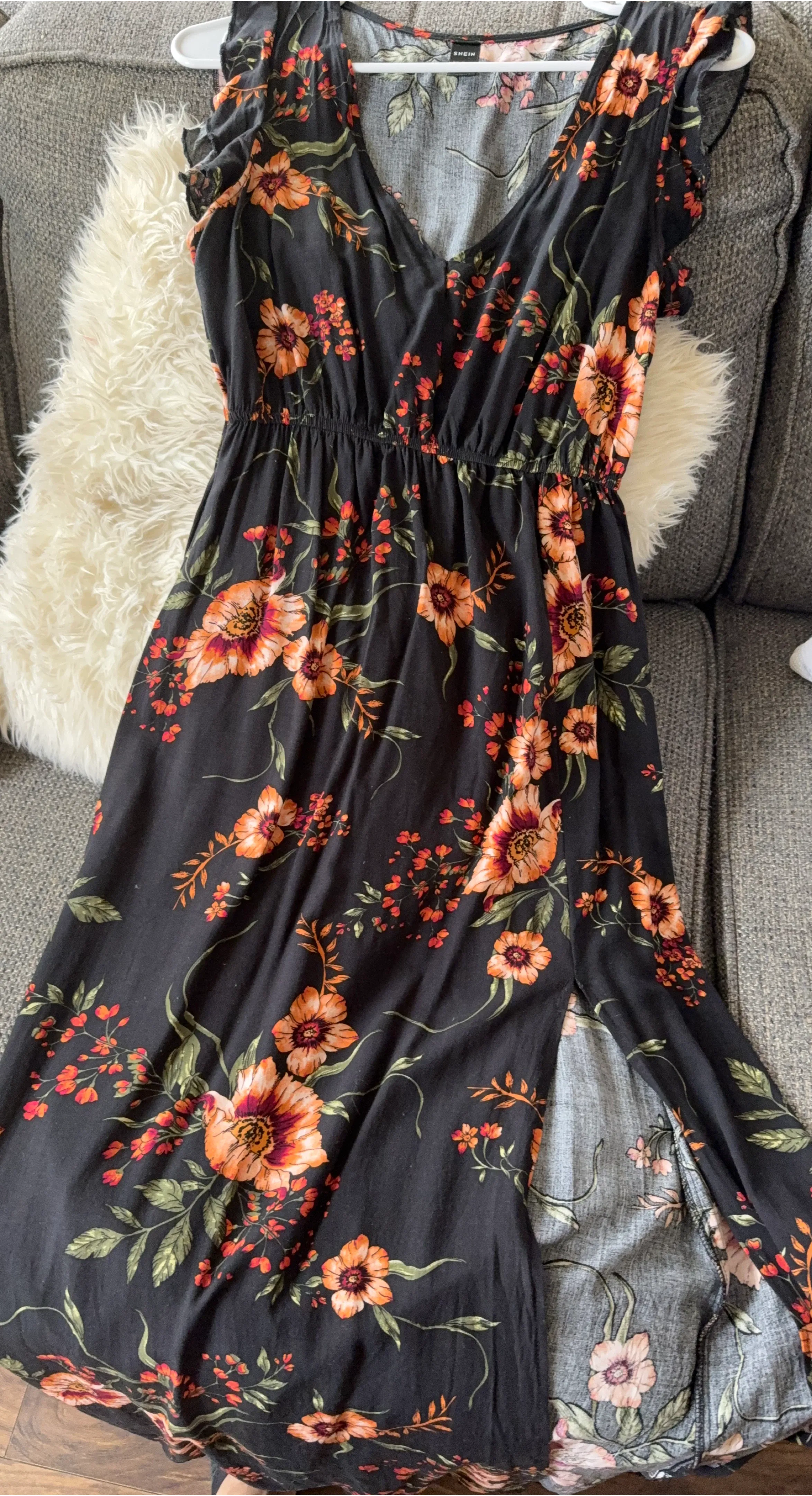 This SHEIN maxi dress features a black base with a vibrant floral print in shades of orange and red. It has a V-neckline, flutter sleeves, and a high slit on the side. The fabric feels lightweight and drapes nicely. Perfect for casual outings or a vacation!