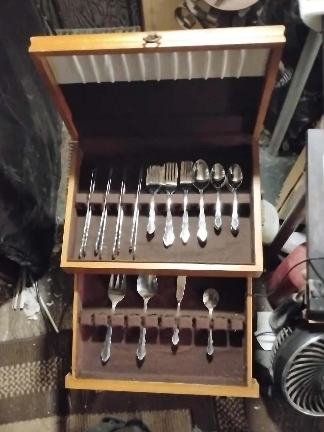 This is a silverware set in a wooden case. It includes multiple forks, spoons, and knives. The case has a felt-lined interior with compartments for each piece.