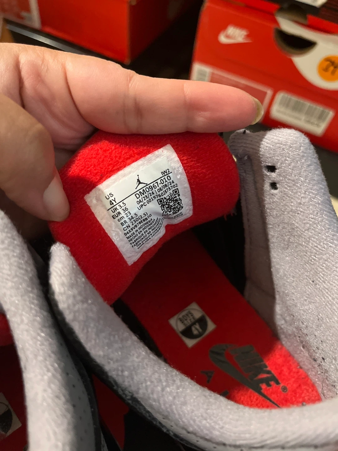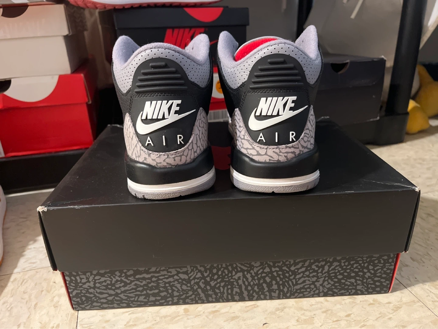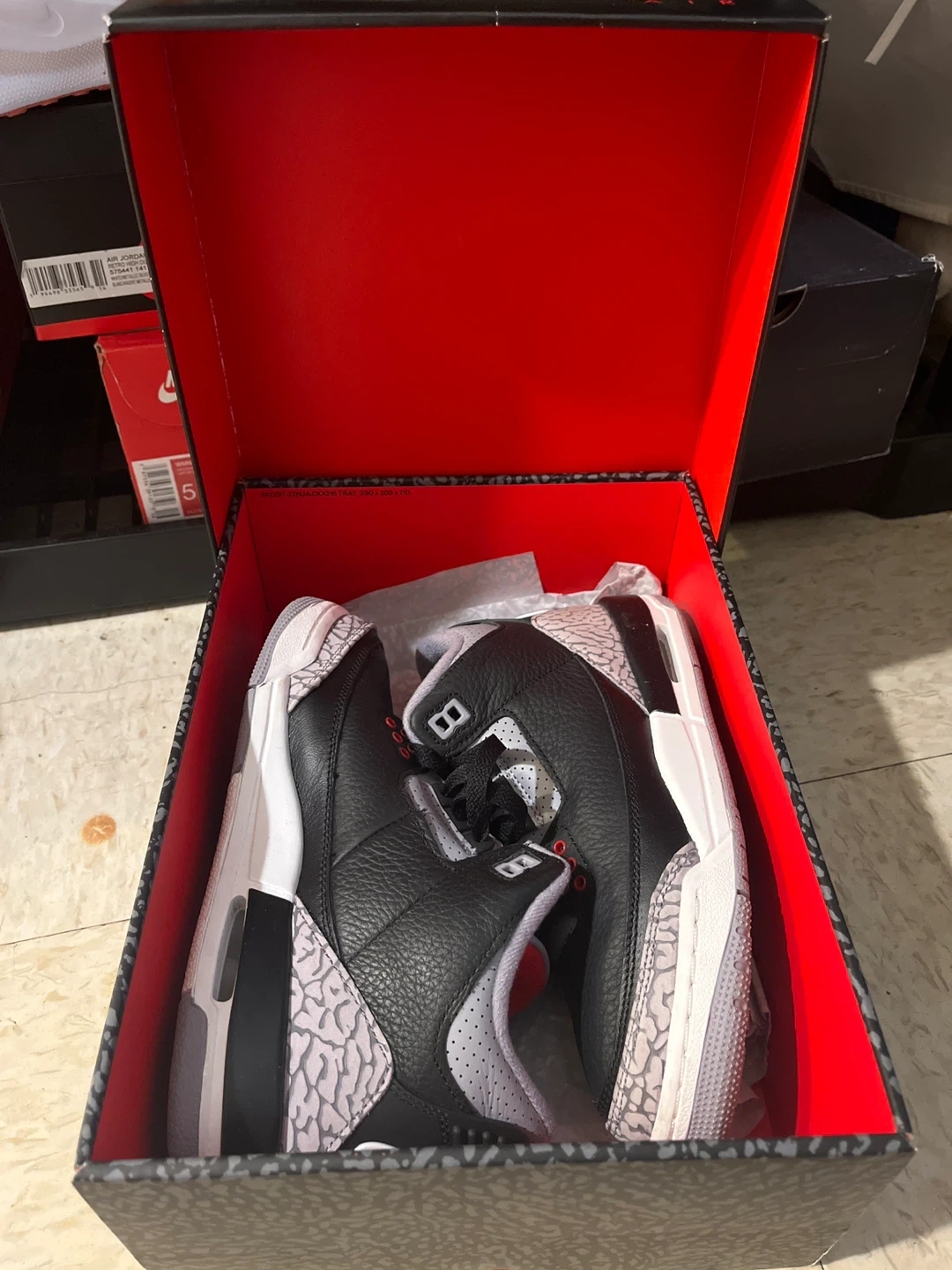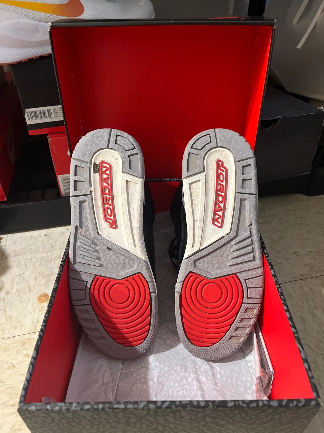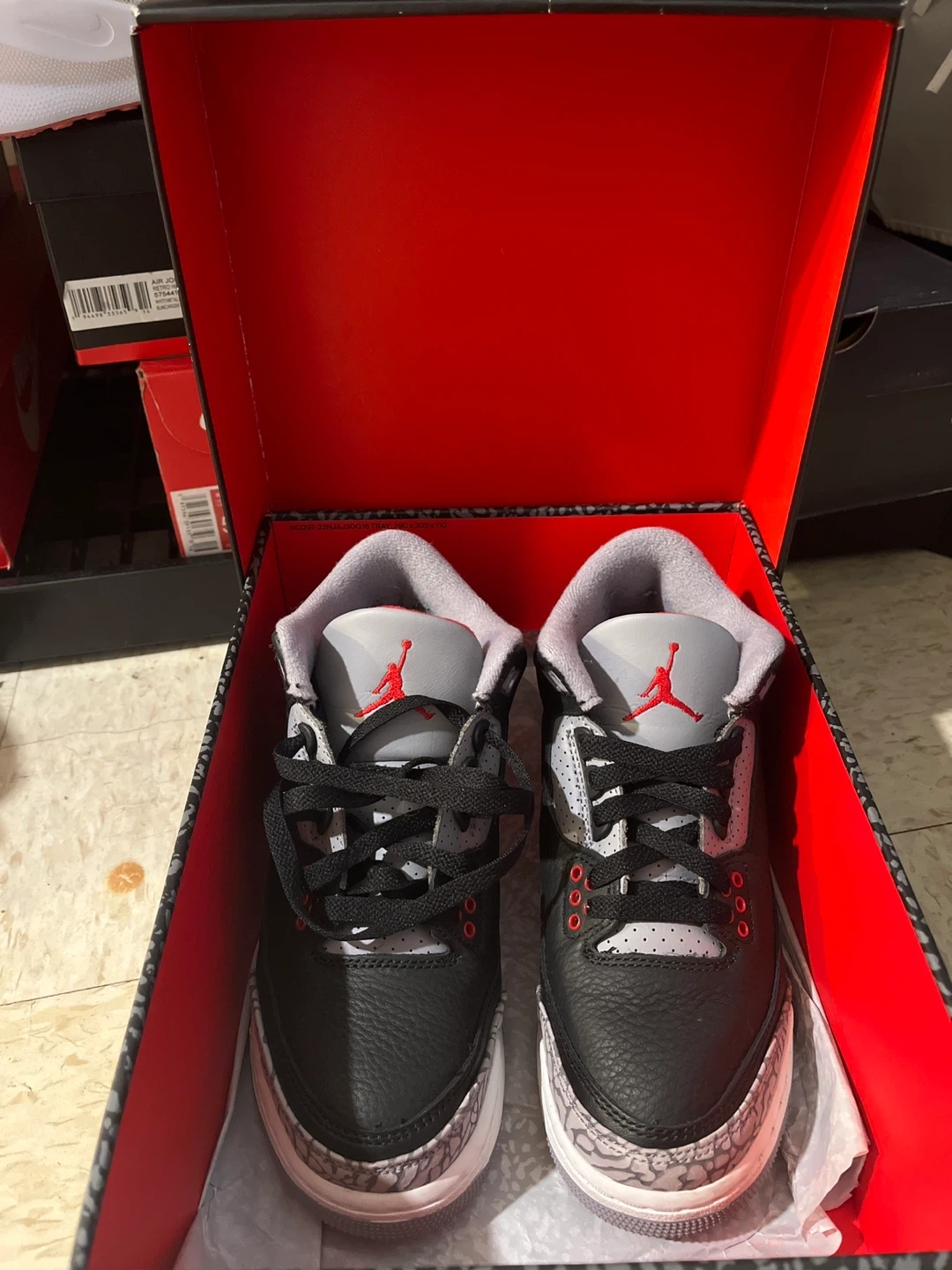 Pre owned. These are Nike Air Jordan 3 Retro (GS) sneakers. They feature a black, gray, and red colorway with elephant print accents. Includes the original box.