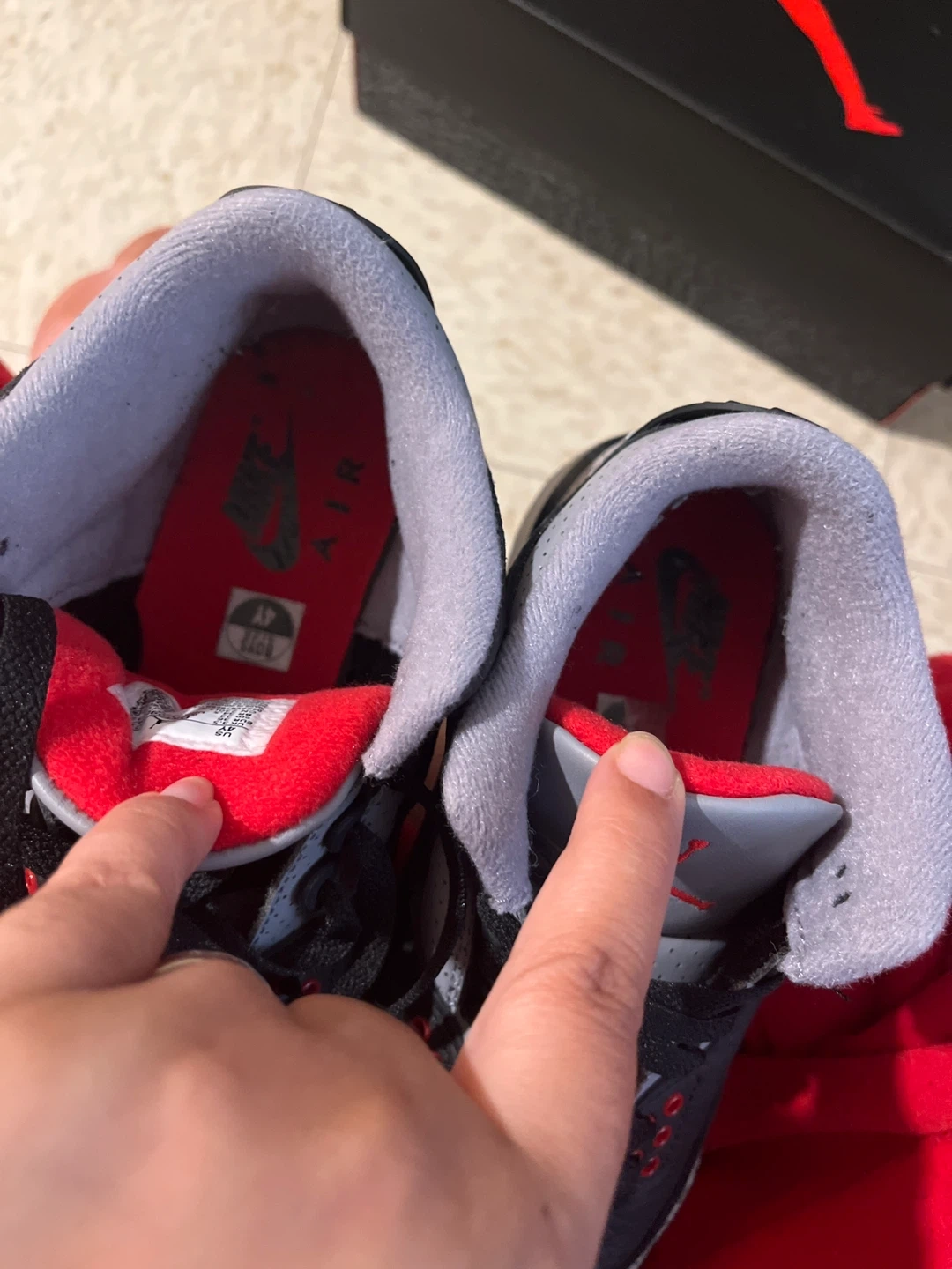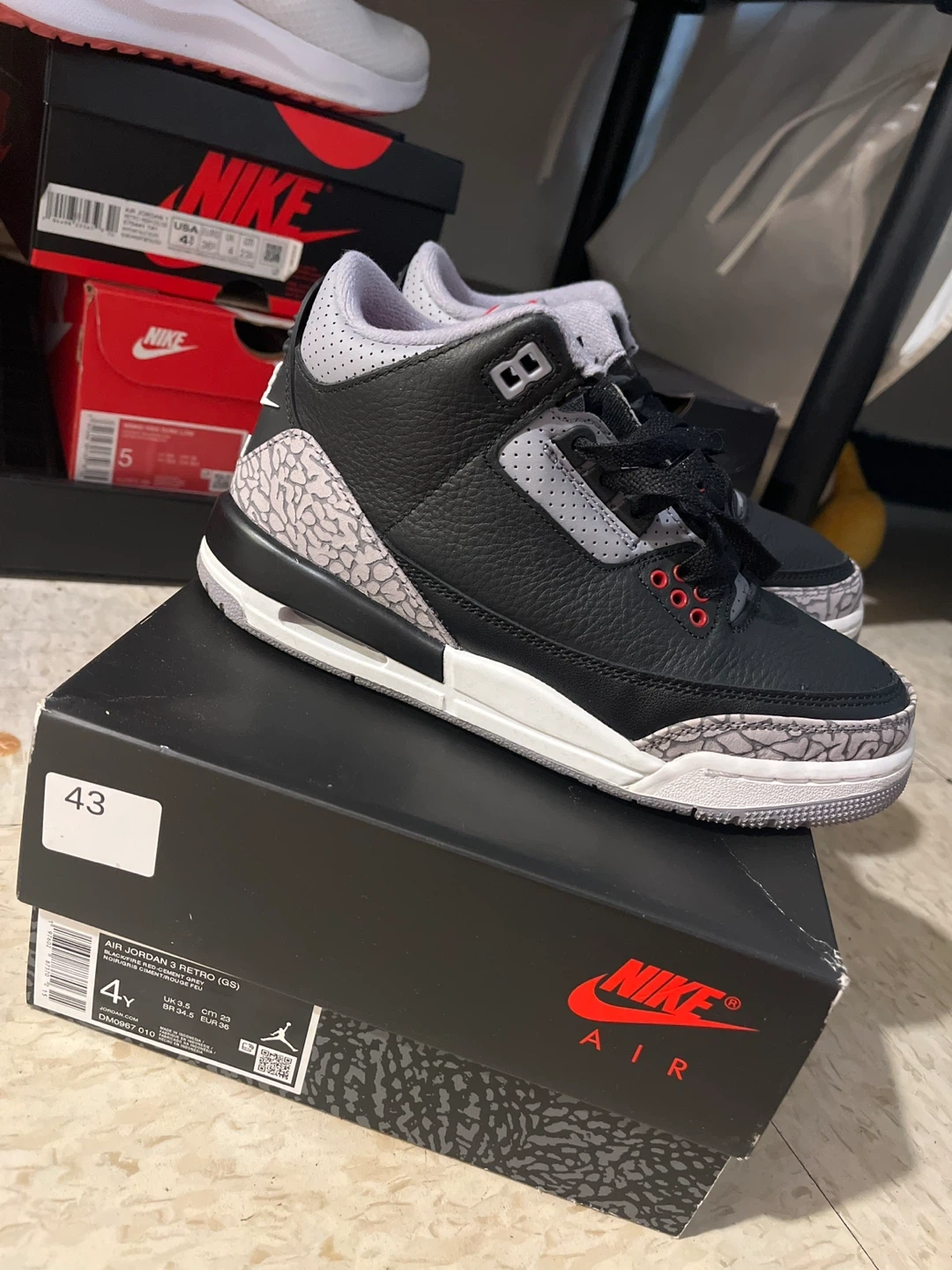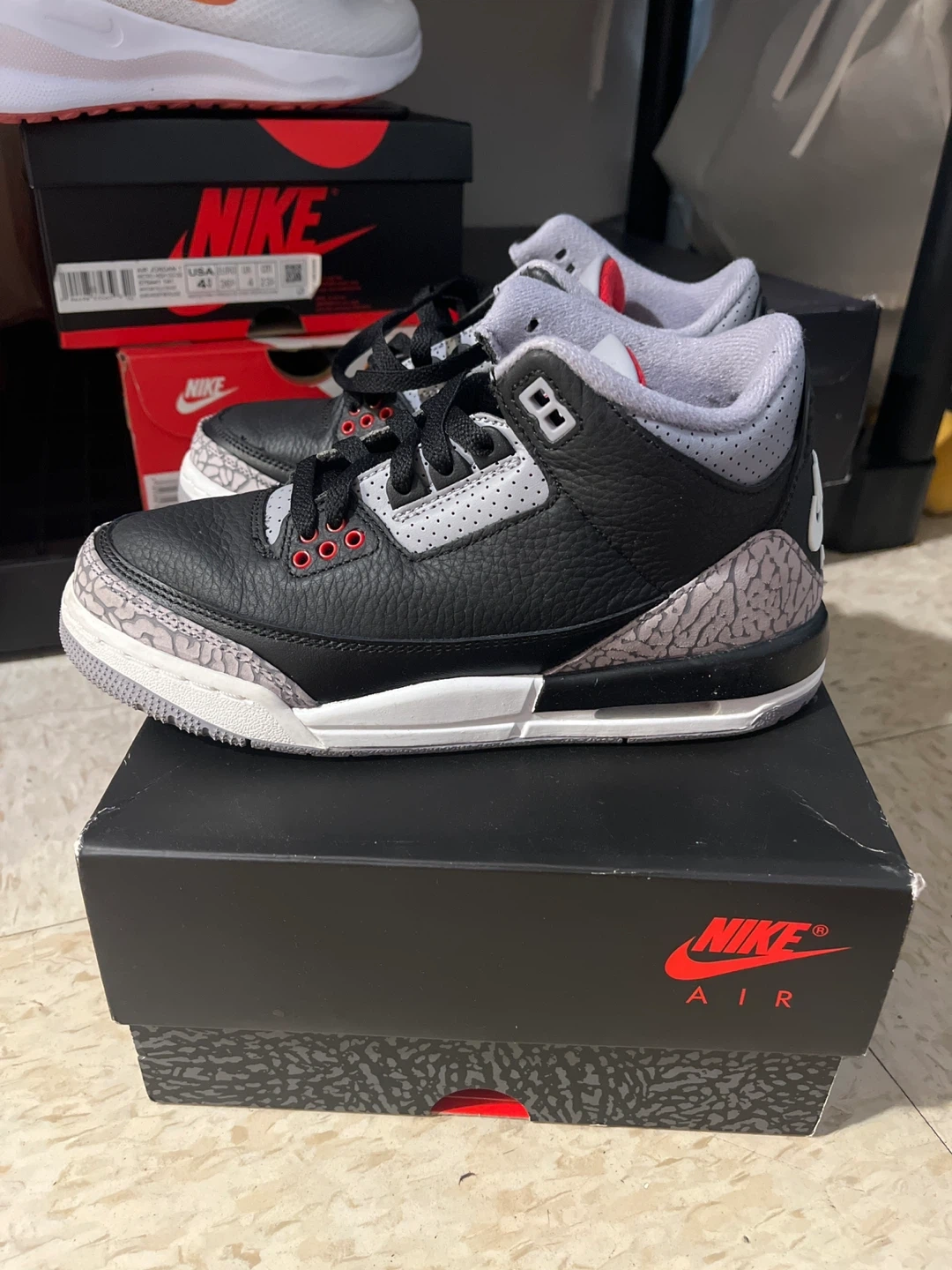 Pre owned. These are Nike Air Jordan 3 Retro (GS) sneakers. They feature a black, gray, and red colorway with elephant print accents. Includes the original box.