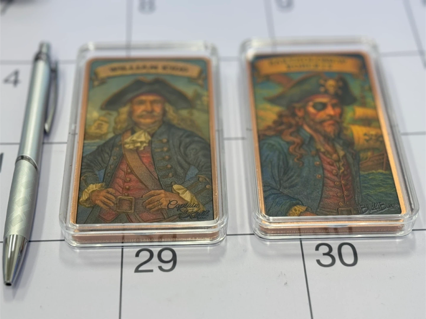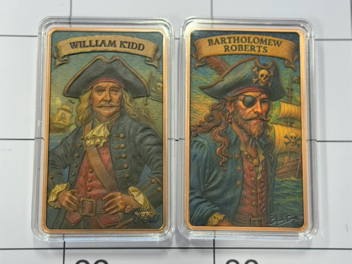 Two 10-ounce bars of 999 fine copper. Each bar depicts a famous pirate: William Kidd and Bartholomew Roberts. Features detailed embossed designs.