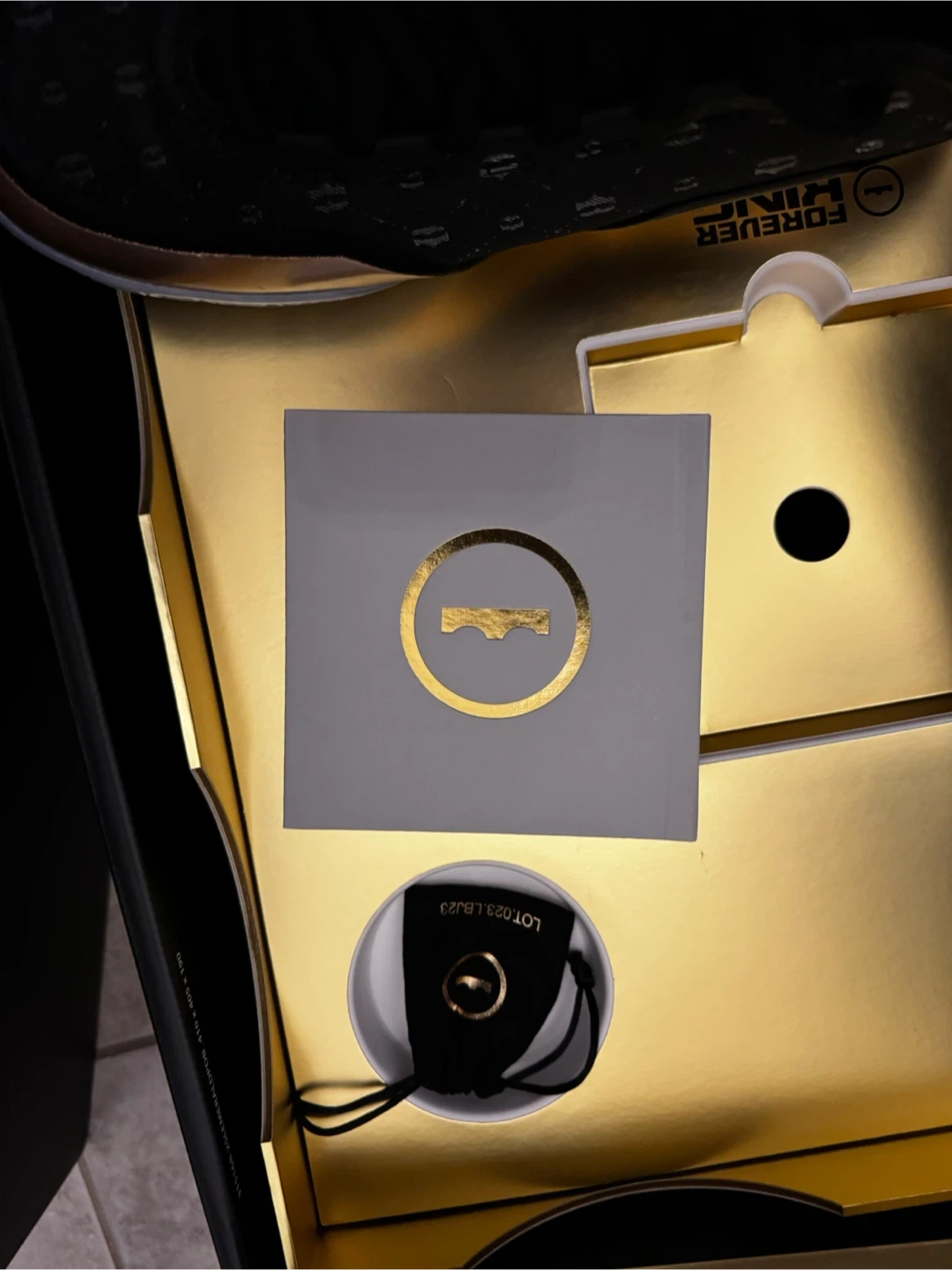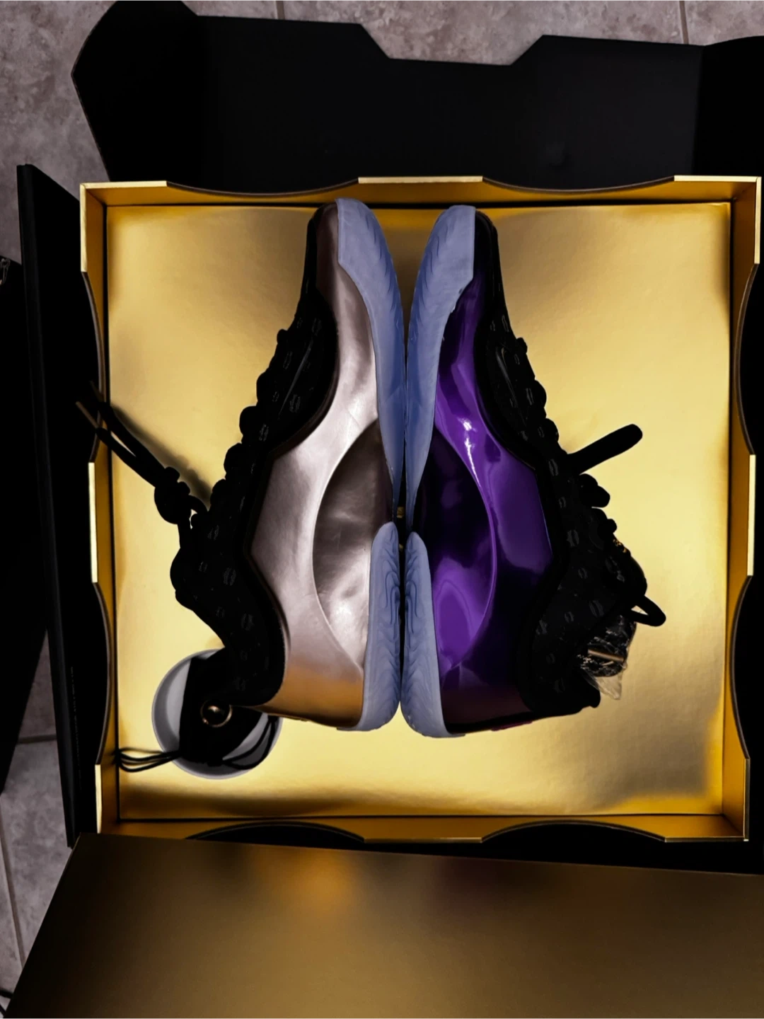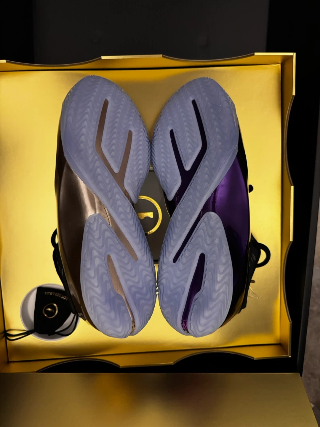 These Forever King sneakers come in a special box. They feature a metallic purple and gold design with black accents and a translucent sole. Includes original packaging.
