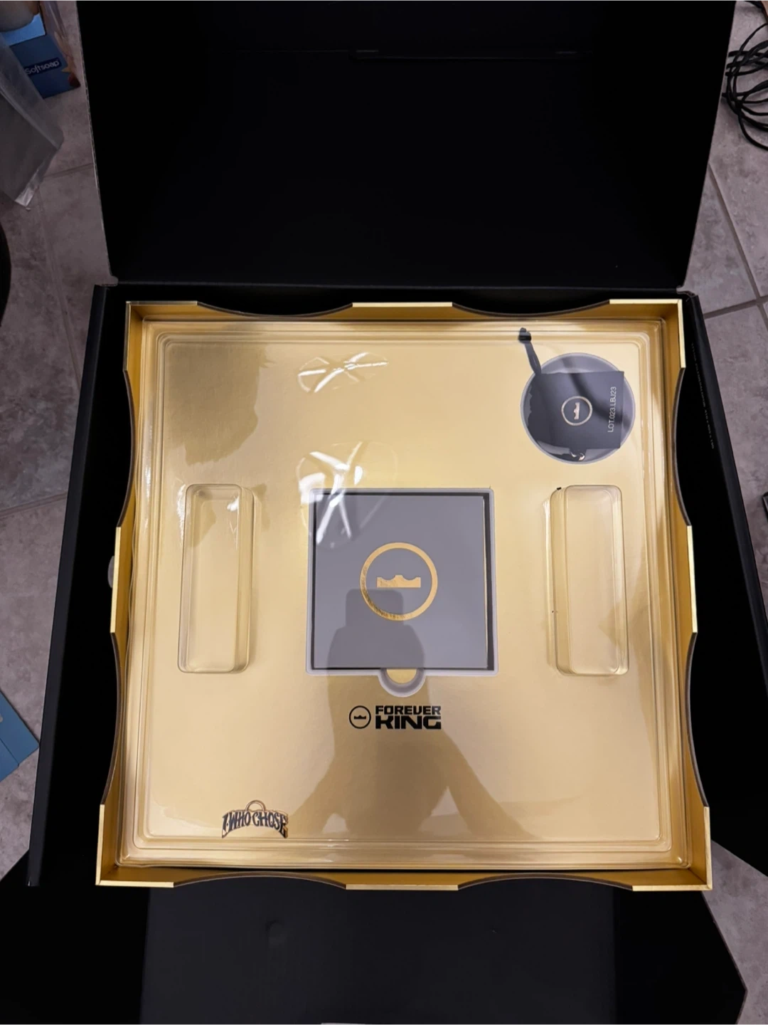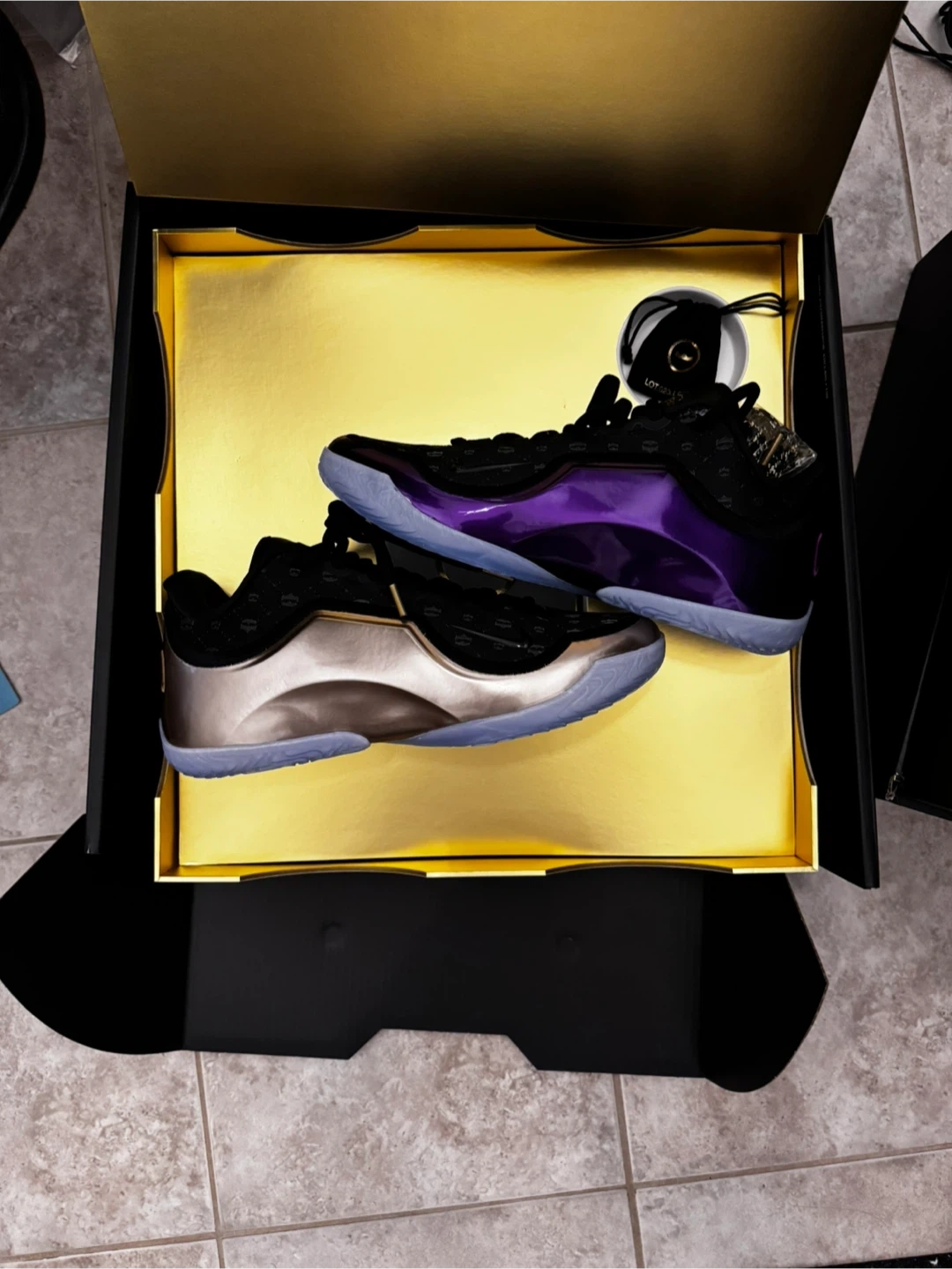 These Forever King sneakers come in a special box. They feature a metallic purple and gold design with black accents and a translucent sole. Includes original packaging.