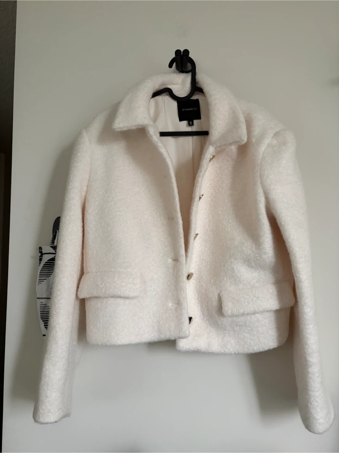 This DYNAMITE jacket is a stylish white boucle cropped style. It features a classic collar and two front flap pockets. Its fuzzy texture adds a cozy feel. Great for layering in cooler weather!