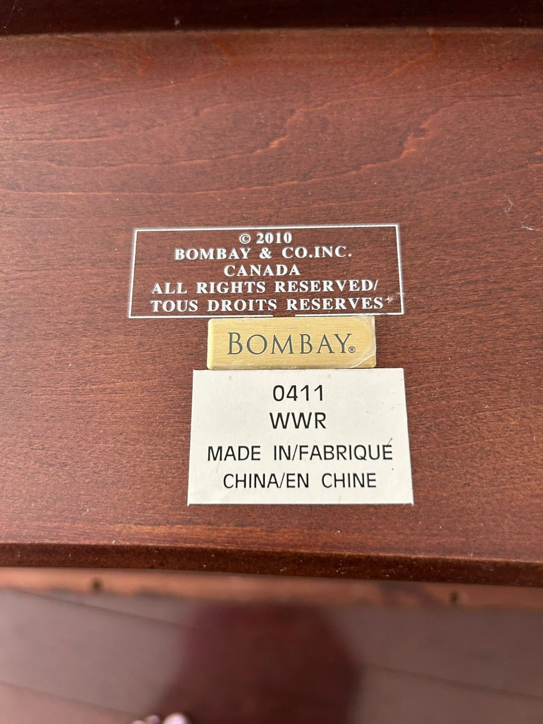 This Bombay Company console table features a rich, dark wood finish with a decorative inlay on the top. It has two drawers with pull knobs and a lower shelf for storage. Made in China. Manufactured in 2010. Perfect for entryways or living spaces!
