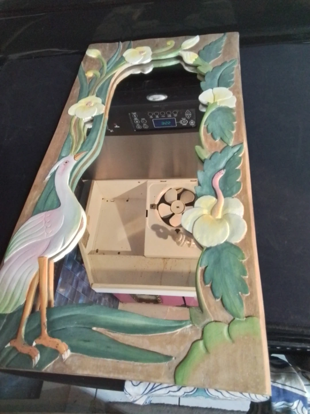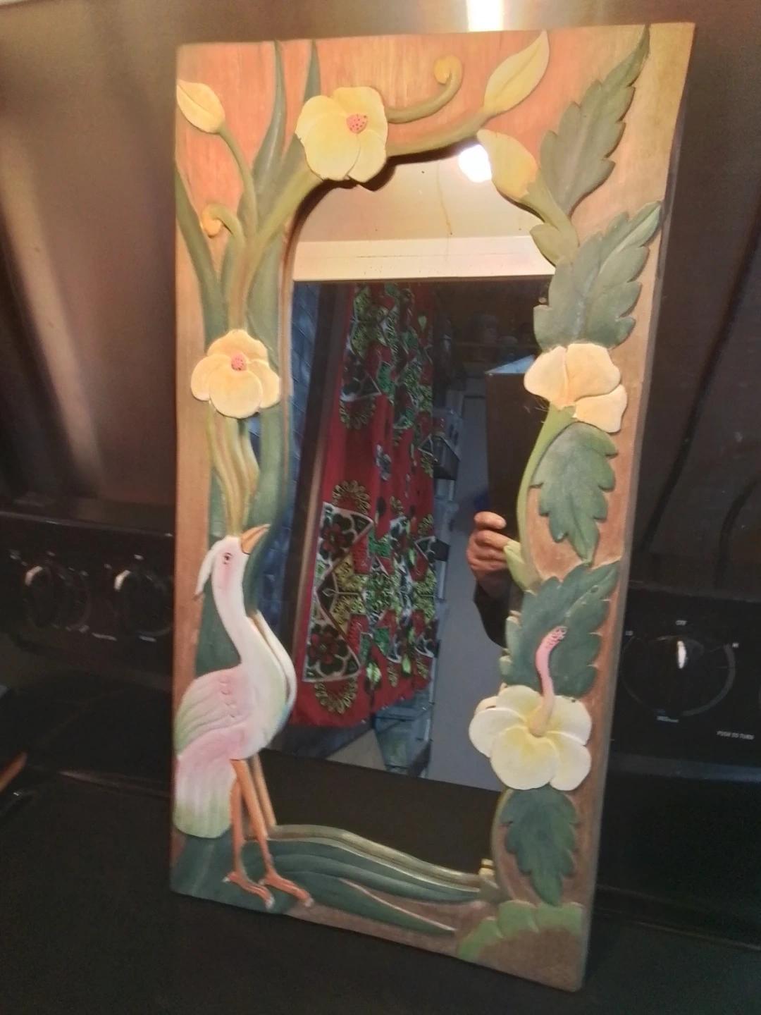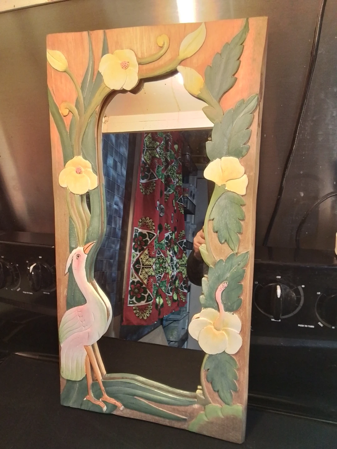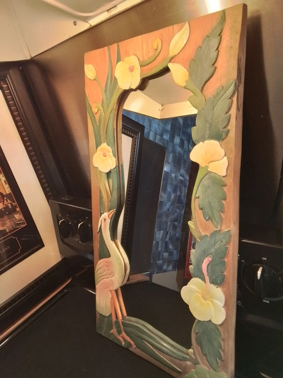 This is a unique, vintage mirror featuring a hand-carved wooden frame that measures 12.5 inches by 24 inches. The mirror is in good condition for its age, showcasing a charming, rustic aesthetic with a hand-carved scene that includes a heron and flowers. There are some minor signs of wear, which only add to its vintage appeal, indicating it is a used item.