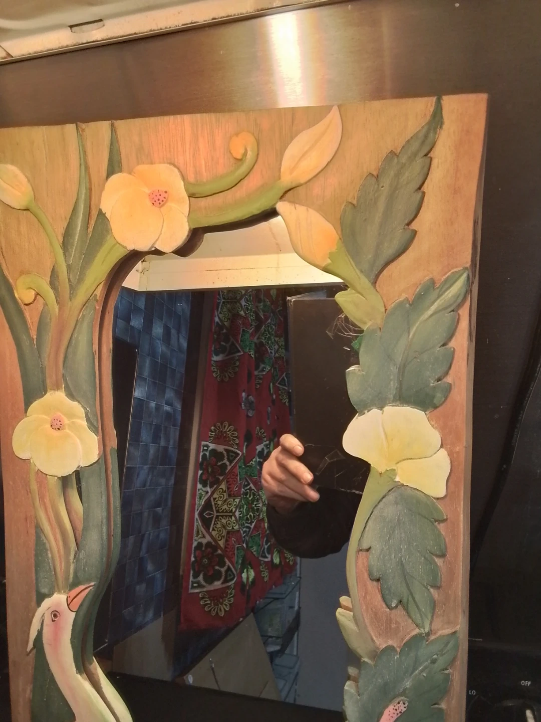 Decorative wall mirror featuring a hand-carved wooden frame. The frame depicts a bird with flowers and leaves, painted in soft colours. Adds a touch of artistry to any room!