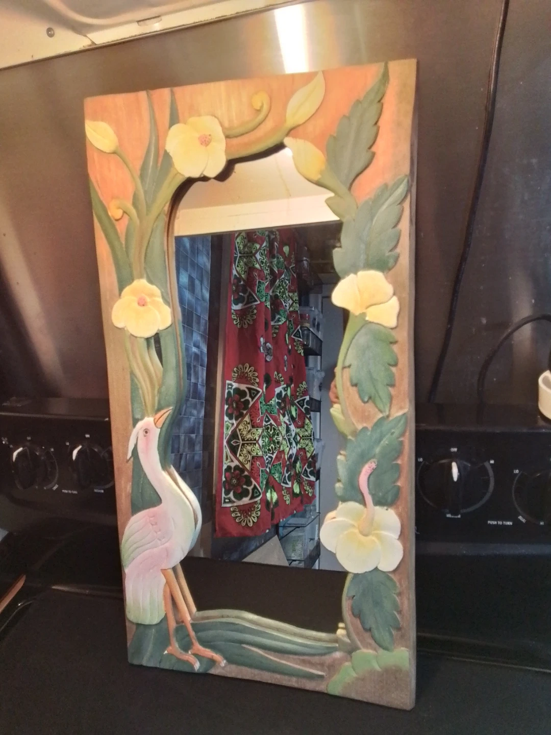 This is a unique, vintage mirror featuring a hand-carved wooden frame that measures 12.5 inches by 24 inches. The mirror is in good condition for its age, showcasing a charming, rustic aesthetic with a hand-carved scene that includes a heron and flowers. There are some minor signs of wear, which only add to its vintage appeal, indicating it is a used item.