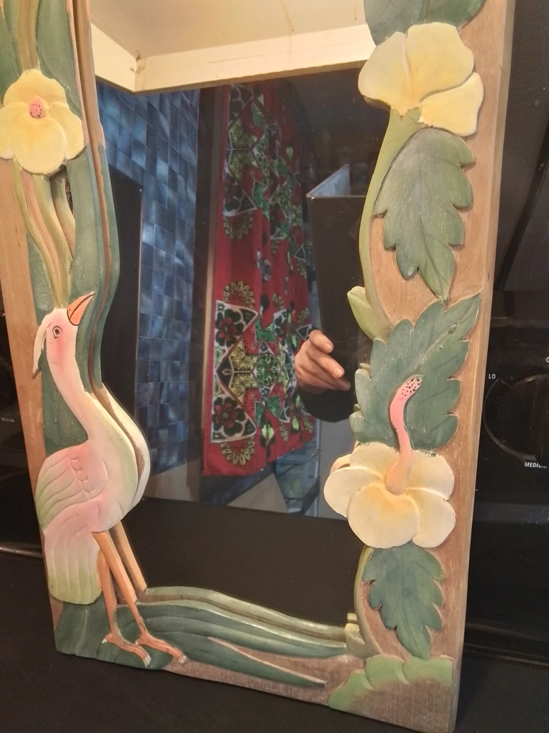 Decorative wall mirror featuring a hand-carved wooden frame. The frame depicts a bird with flowers and leaves, painted in soft colours. Adds a touch of artistry to any room!