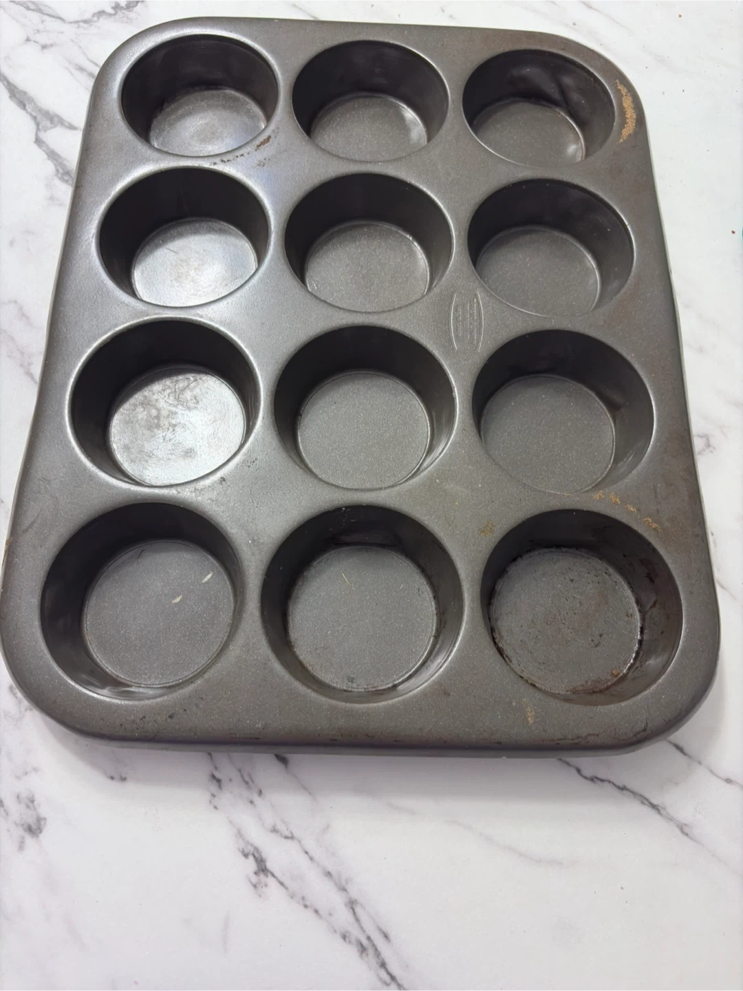 This is a standard 12-cup muffin baking pan. It's made of metal and has been well-used, showing some signs of wear and tear. Great for making muffins or cupcakes!