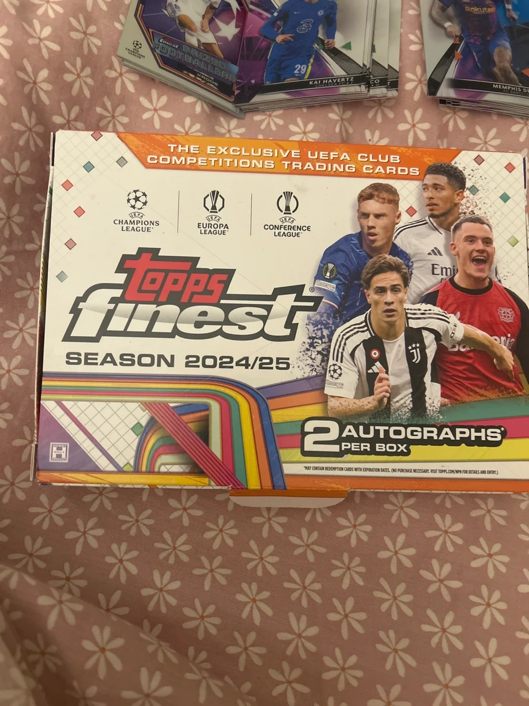 Non autographed Sealed box of Topps Finest UEFA Club Competitions trading cards for the 2024/25 season. Includes 2 autographs per box. Features players from the Champions League, Europa League, and Conference League.