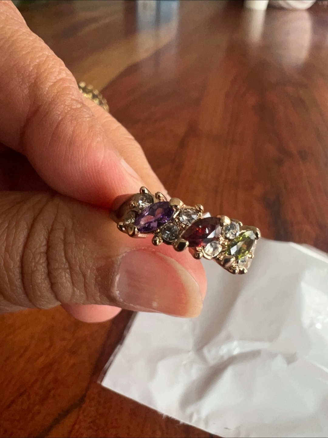 Gold-toned ring. Features various colourful gemstones. Size 19. A ring like this would bring a smile to your face as you go about your day.