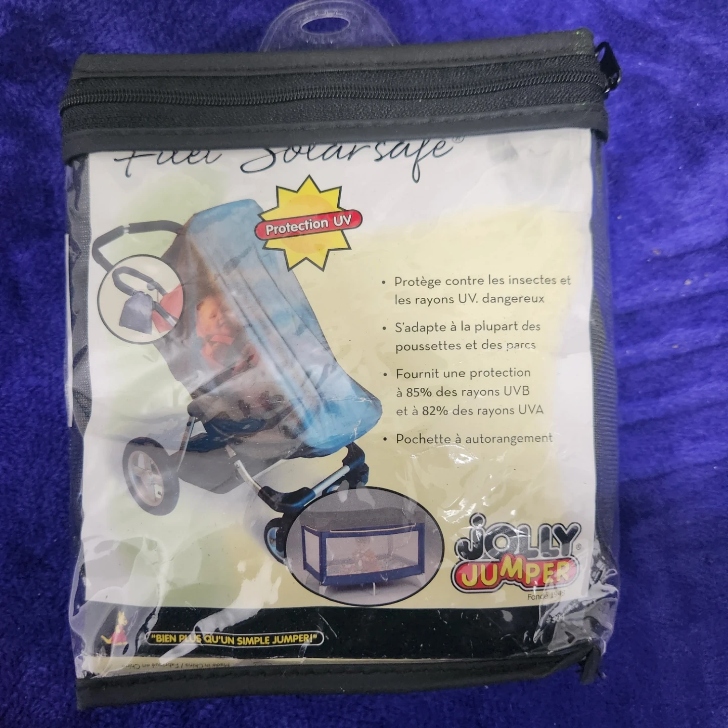 This Jolly Jumper stroller cover protects against insects and dangerous UV rays. It fits most strollers and playpens, offering 85% UVB and 82% UVA protection. It also features an auto-storage pouch!