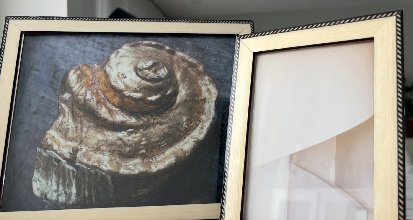 Two decorative photo frames with a textured, braided border. One frame displays a close-up of a seashell, and the other is ready for your own picture. They're a lovely way to showcase your memories!