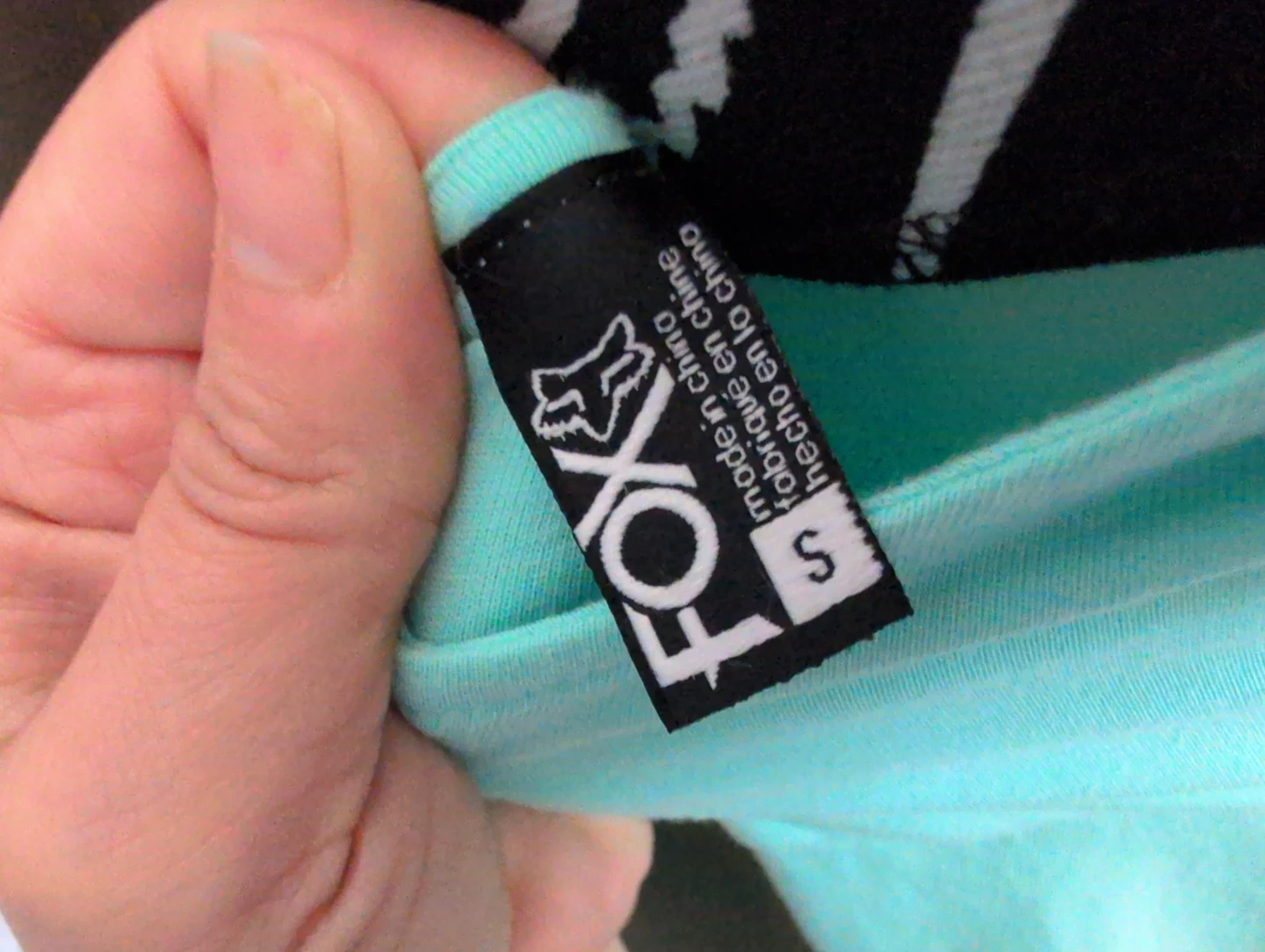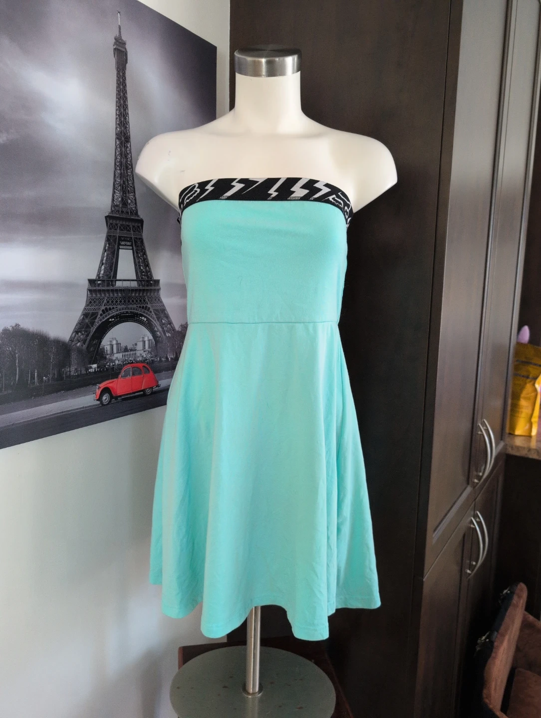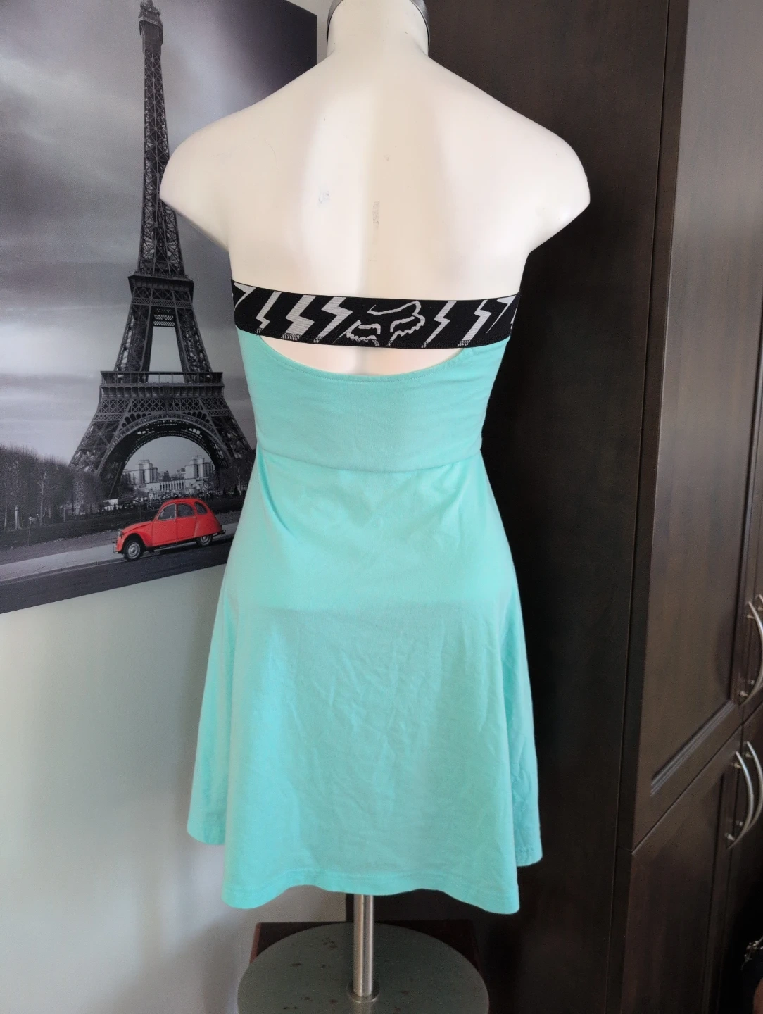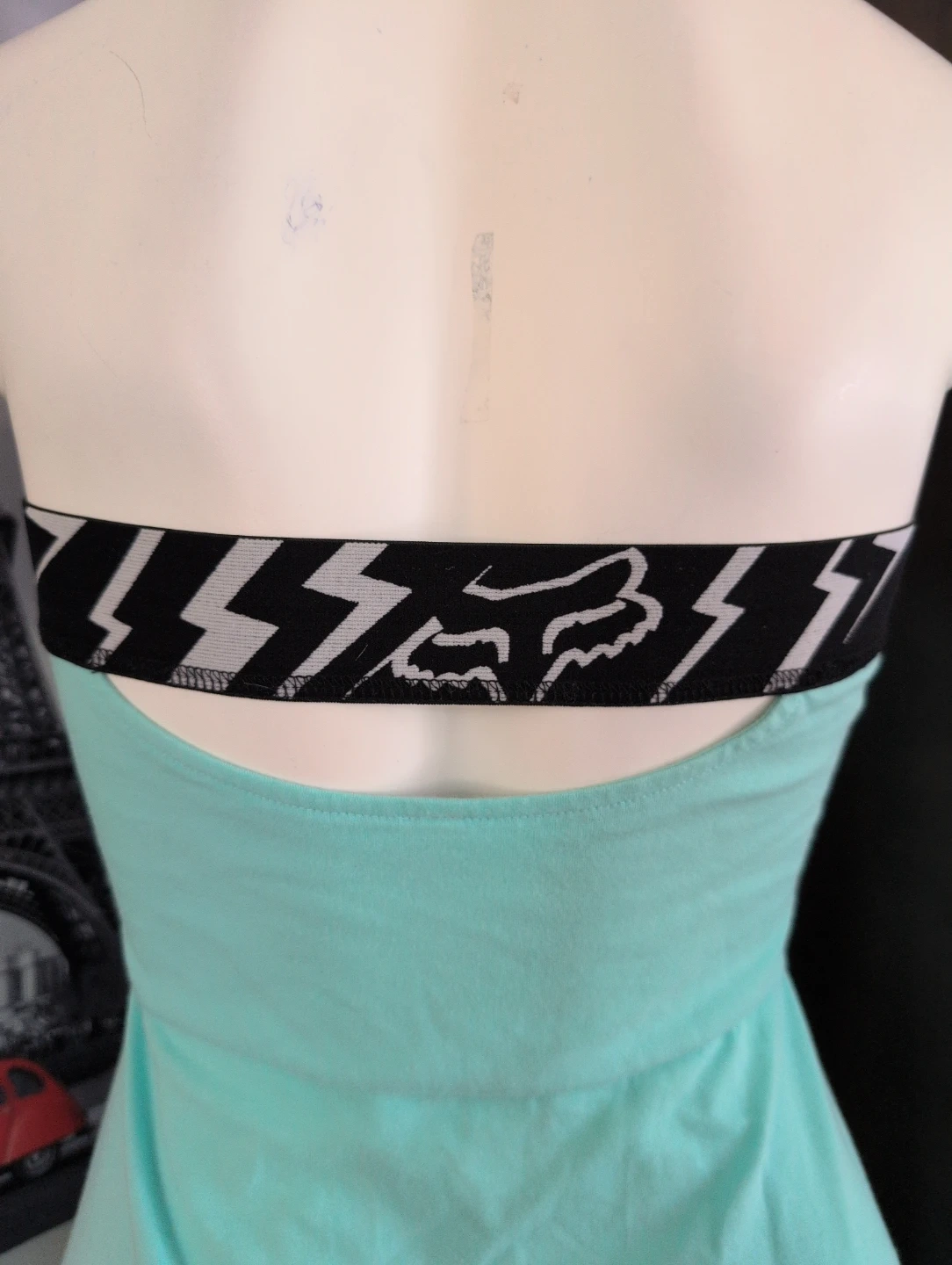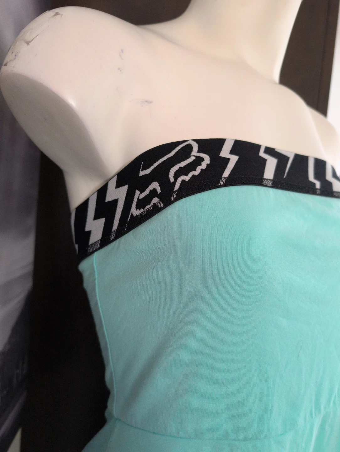 This strapless dress from Fox Racing is a cool mint green colour. It features a black band with lightning bolts and the Fox logo around the bust. Size is small.
