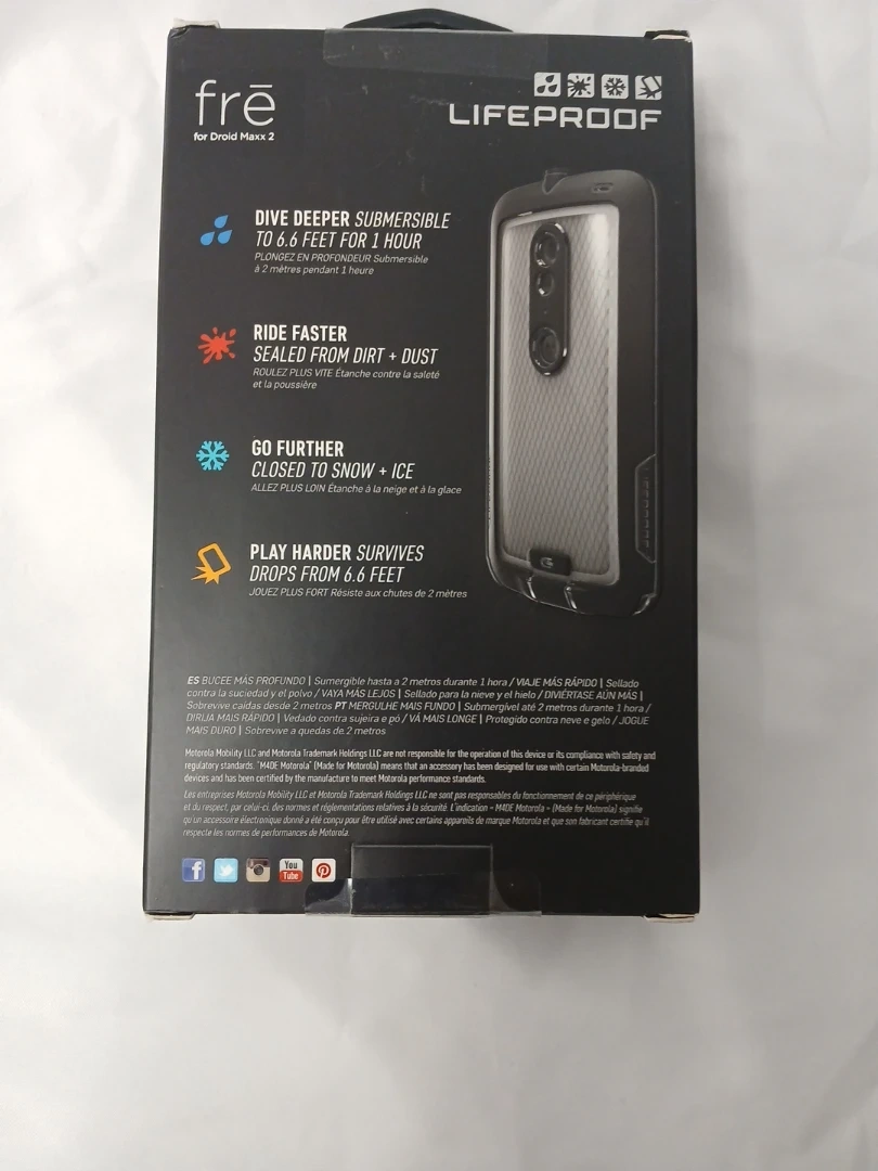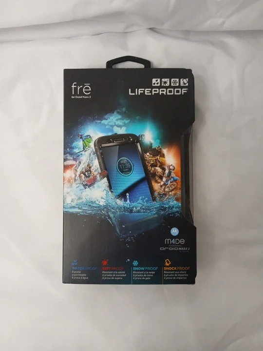 This Lifeproof fre case is designed for the Droid Maxx 2. It's waterproof, dirtproof, snowproof, and shockproof. Includes case, cloth, and audio adapter.