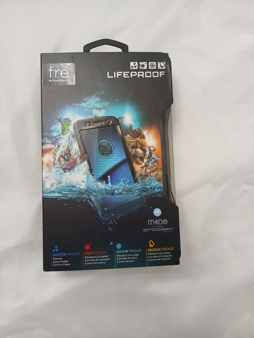 This Lifeproof fre case is designed for the Droid Maxx 2. It's waterproof, dirtproof, snowproof, and shockproof. Includes case, cloth, and audio adapter.