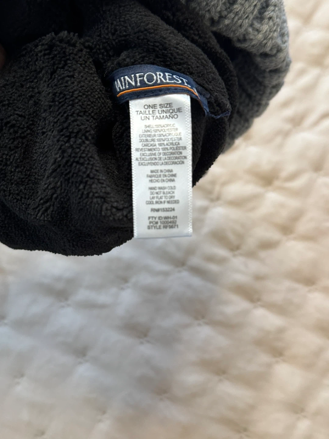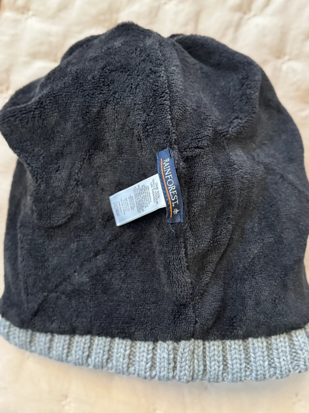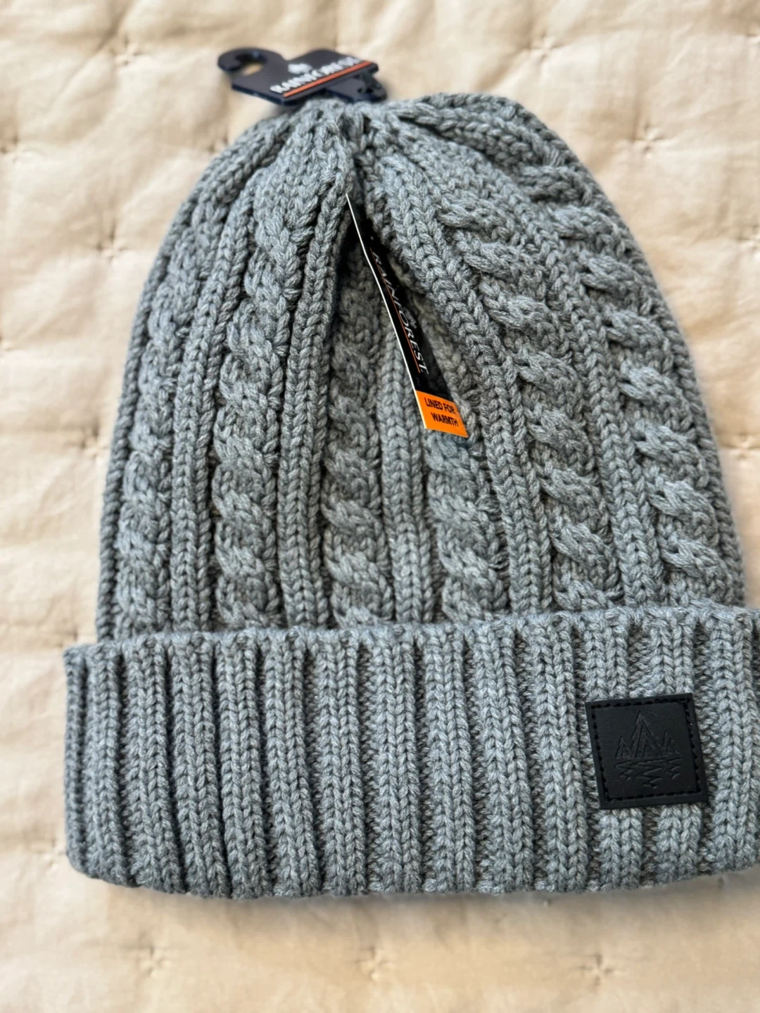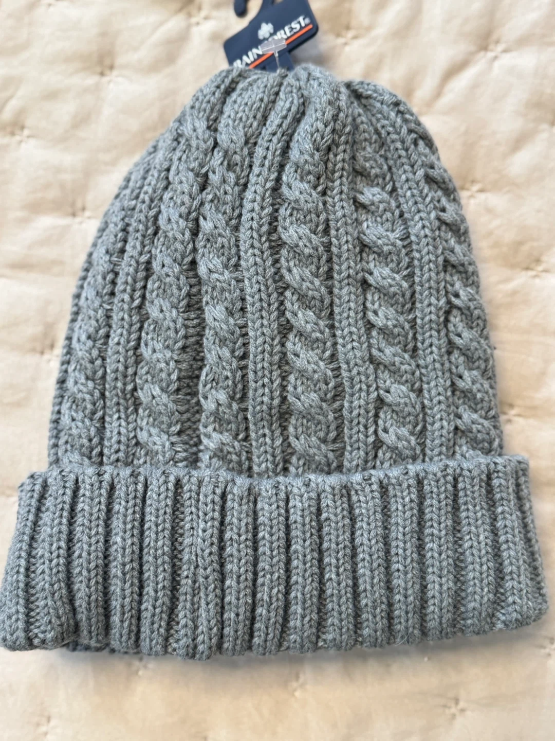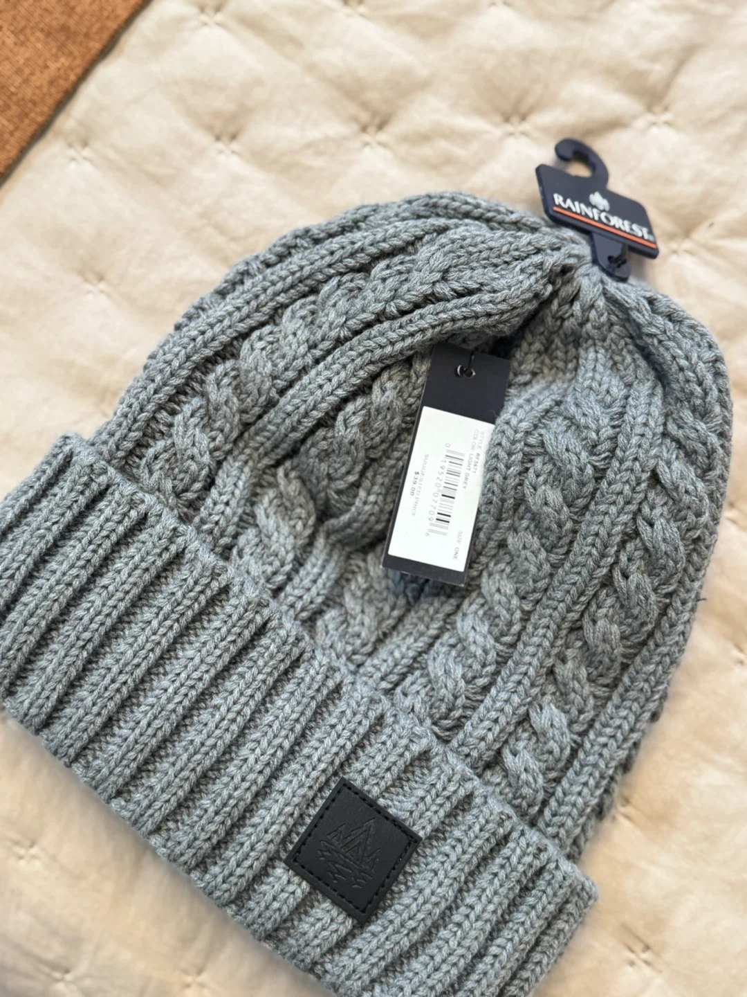 Keep warm with this stylish Rainforest knit beanie! It's a gray color and one size fits all. The shell is made of 100% acrylic, and the lining is 100% polyester. Perfect for those chilly days