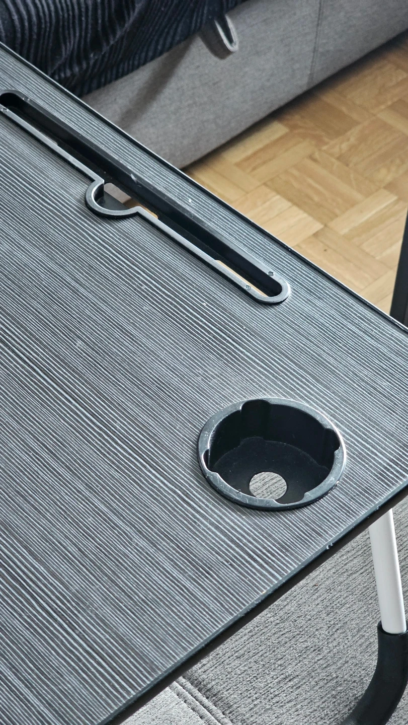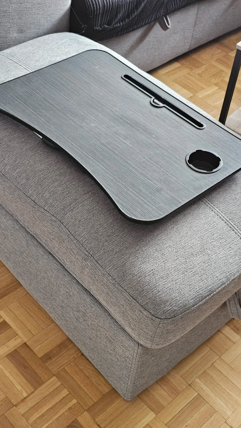 This portable lap desk is perfect for working or browsing on the couch. It features a convenient cup holder and a slot for your tablet. The folding legs make it easy to store away when not in use.