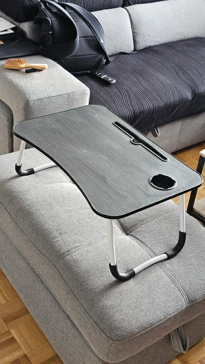 This portable lap desk is perfect for working or browsing on the couch. It features a convenient cup holder and a slot for your tablet. The folding legs make it easy to store away when not in use.