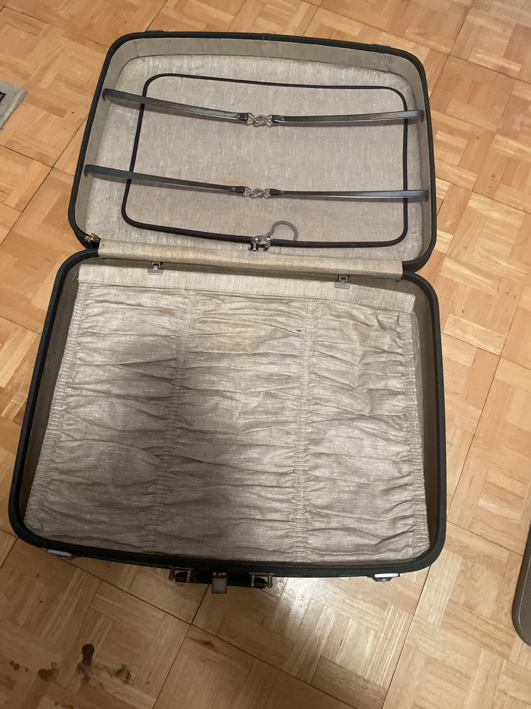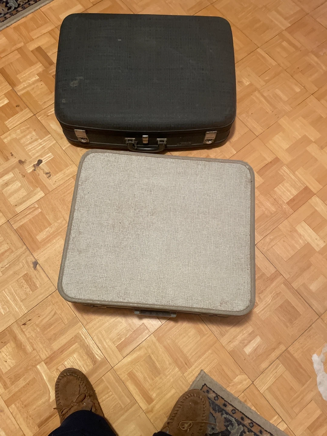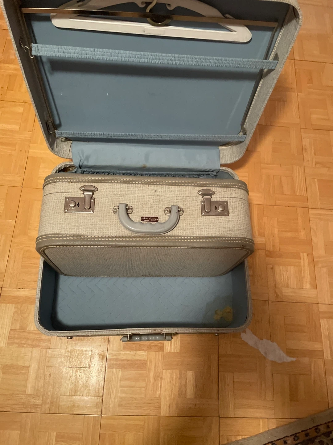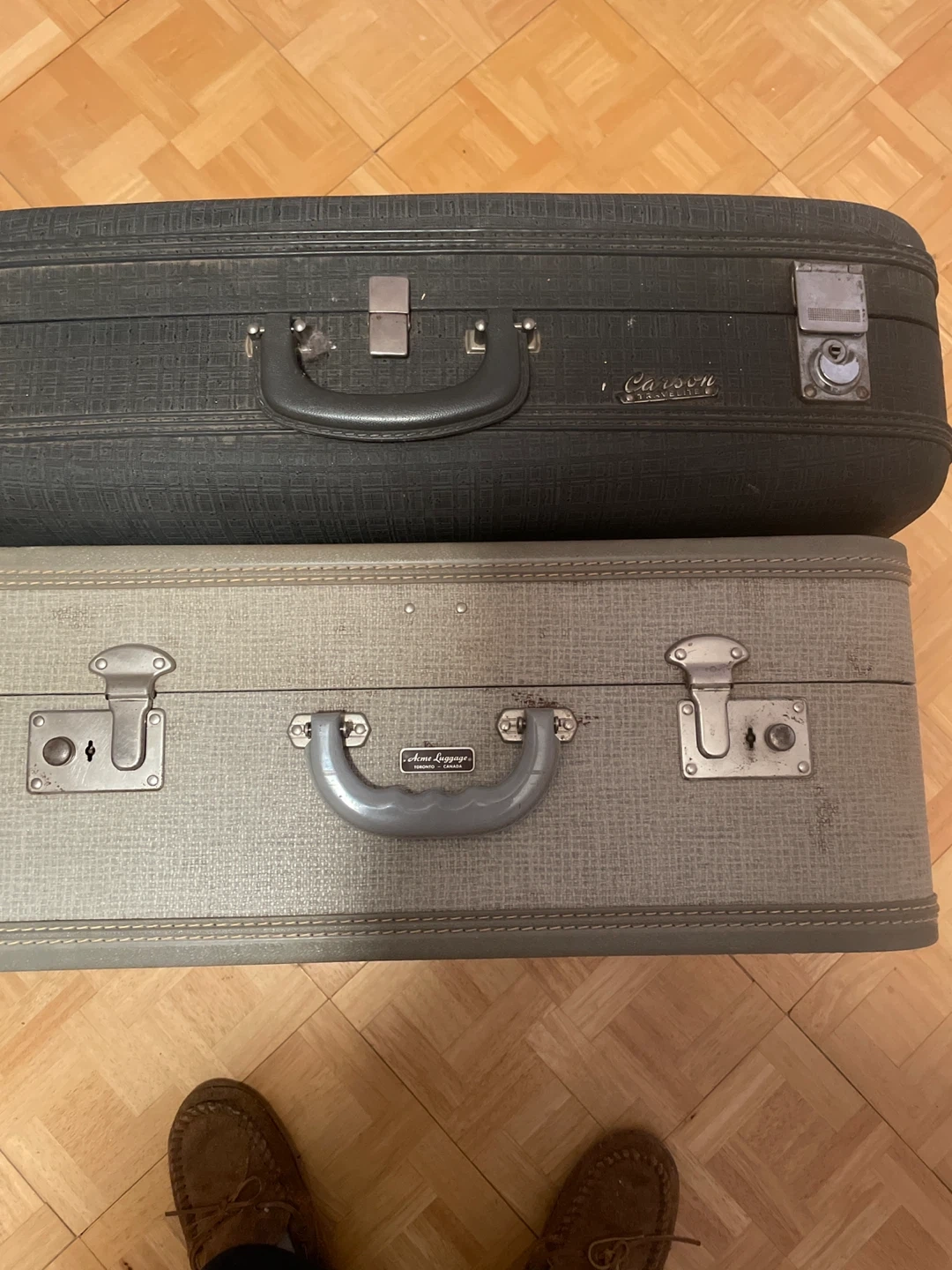 Two vintage suitcases, one grey Carson brand and one textured beige Ame Luggage brand. Both feature metal latches and sturdy handles. They're great for travel or retro decor! $50 cash for both
