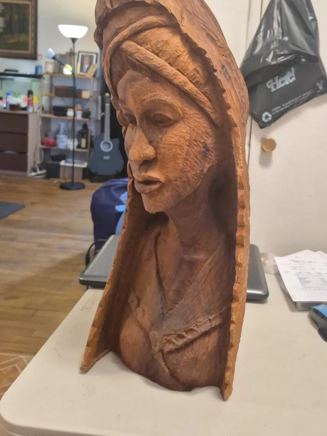 This is a unique hand-carved wooden bust depicting a woman. It's carved from wood and shows intricate detail in the facial features and headwear. The piece has a warm, natural wood finish.