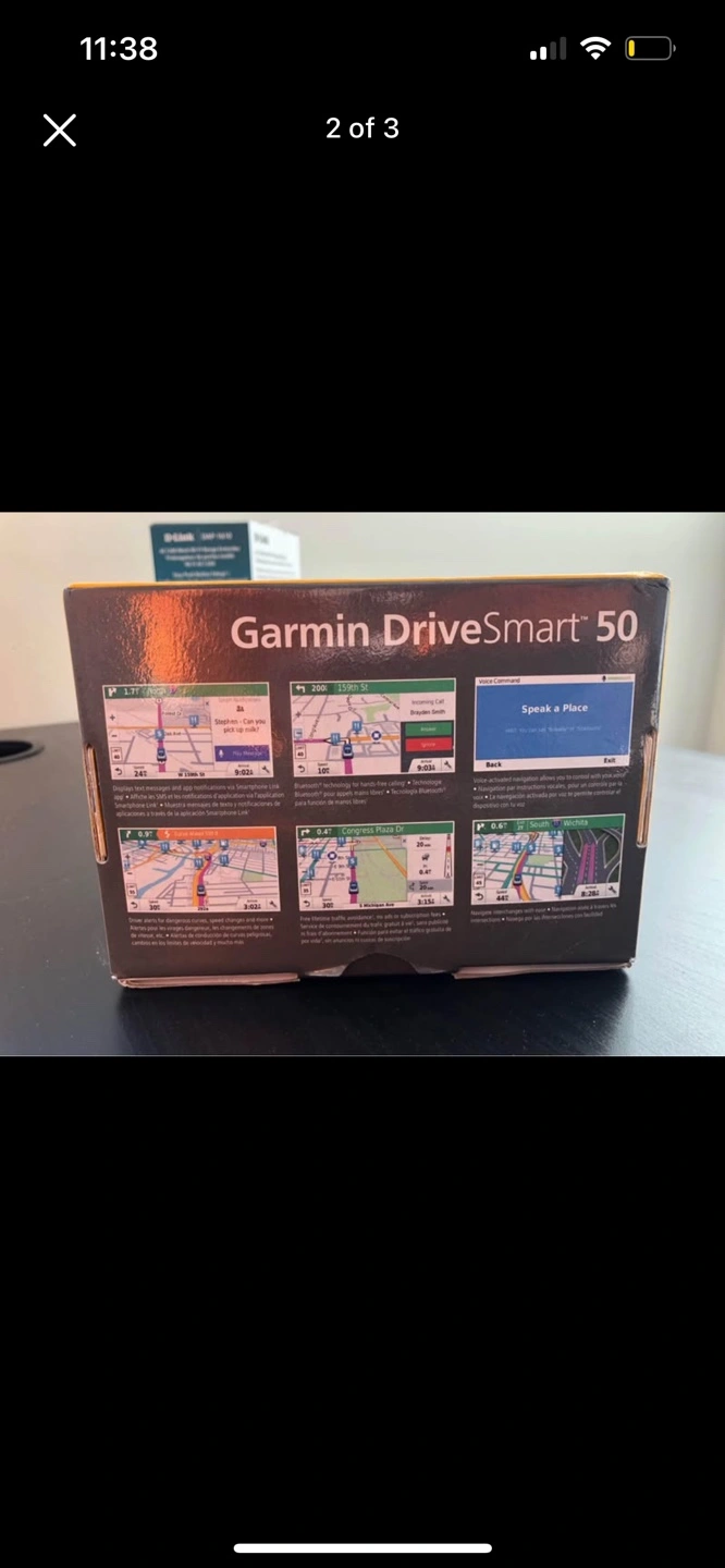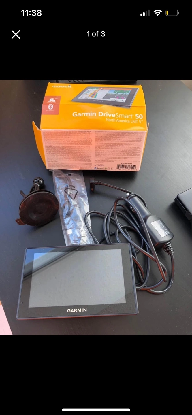 Garmin DriveSmart 50 GPS. Includes device, power adapter, suction cup mount. North America maps. Box included.