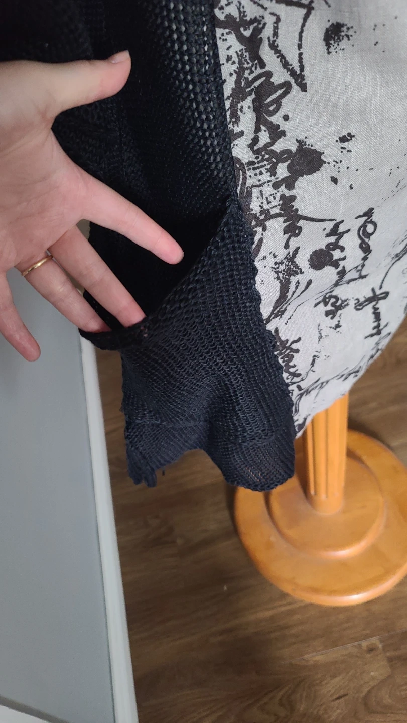 It is a really nice piece for layering. The black sleeves, side panels, cowl neck, and the two deep front pockets are knitted and see-though so you'll want to wear a layer underneath for coverage.