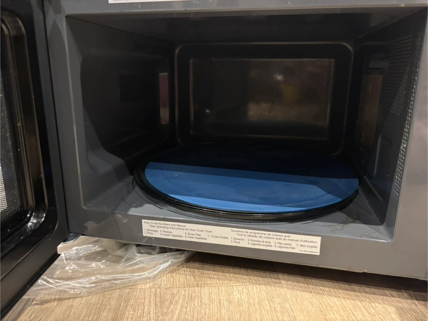 This is a Panasonic microwave oven with 1000W high power. It has an auto cook chart for various food items. The interior capacity is suitable for most household needs. It's perfect for quick meals and reheating.