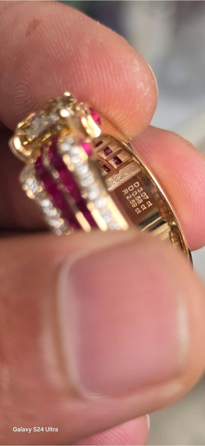 This listing includes a collection of loose emeralds in various cuts, presented in a display case. Additionally, a gold ring with rubies and diamonds is shown, featuring hallmarks that indicate its material and purity. The emeralds display vibrant green hues and good clarity. The ring's markings suggest it's a valuable piece.