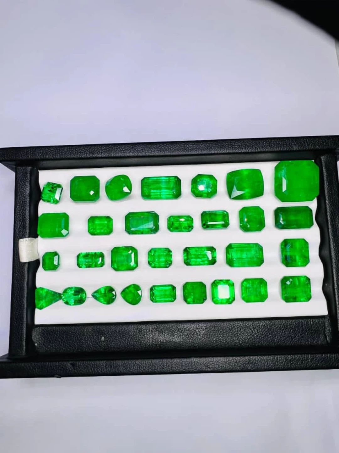 This listing includes a collection of loose emeralds in various cuts, presented in a display case. Additionally, a gold ring with rubies and diamonds is shown, featuring hallmarks that indicate its material and purity. The emeralds display vibrant green hues and good clarity. The ring's markings suggest it's a valuable piece.