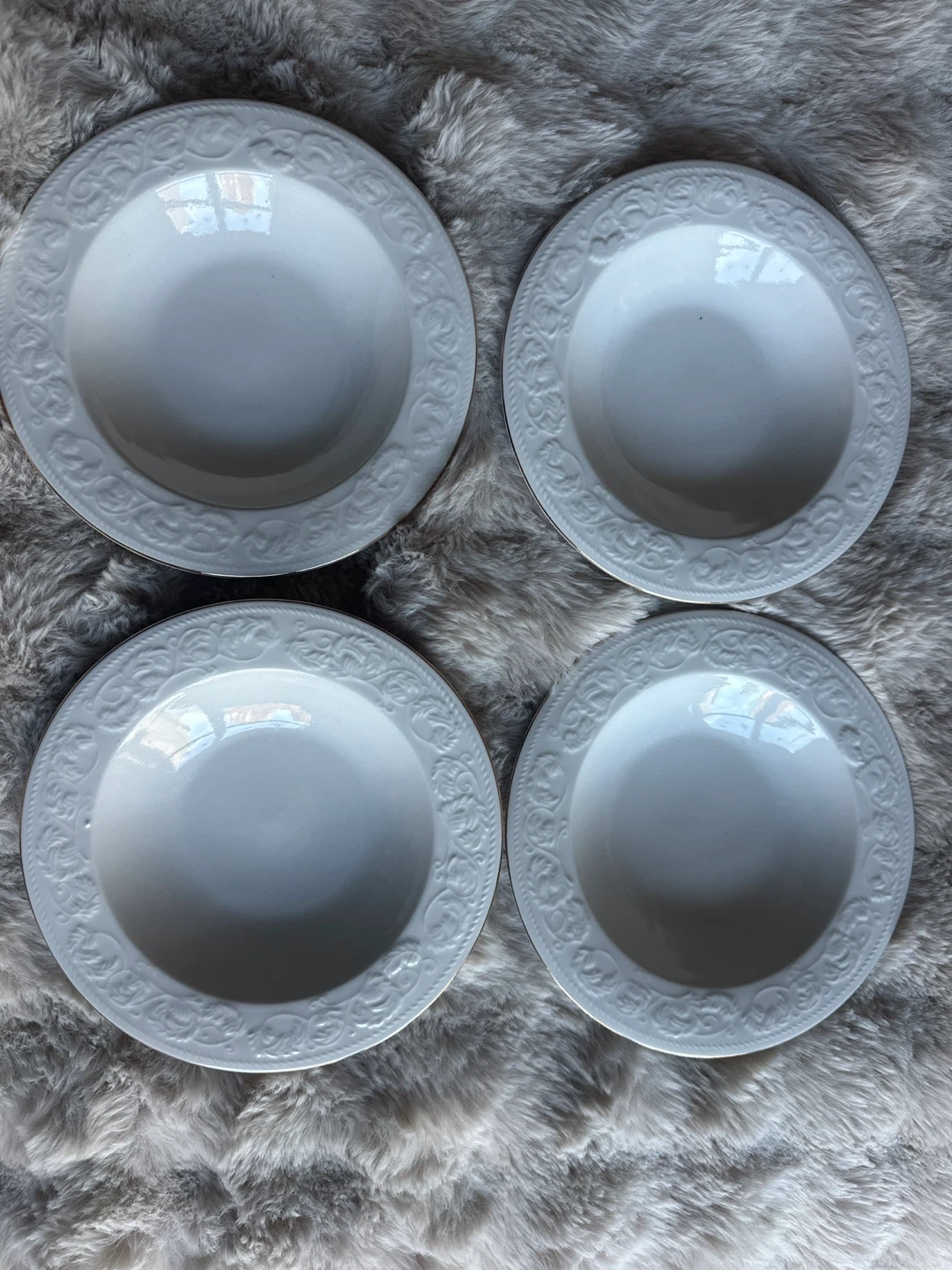 8” plates & 9” bowls. They are white with a detailed, embossed rim and a thin gold trim. These plates are not microwave safe.