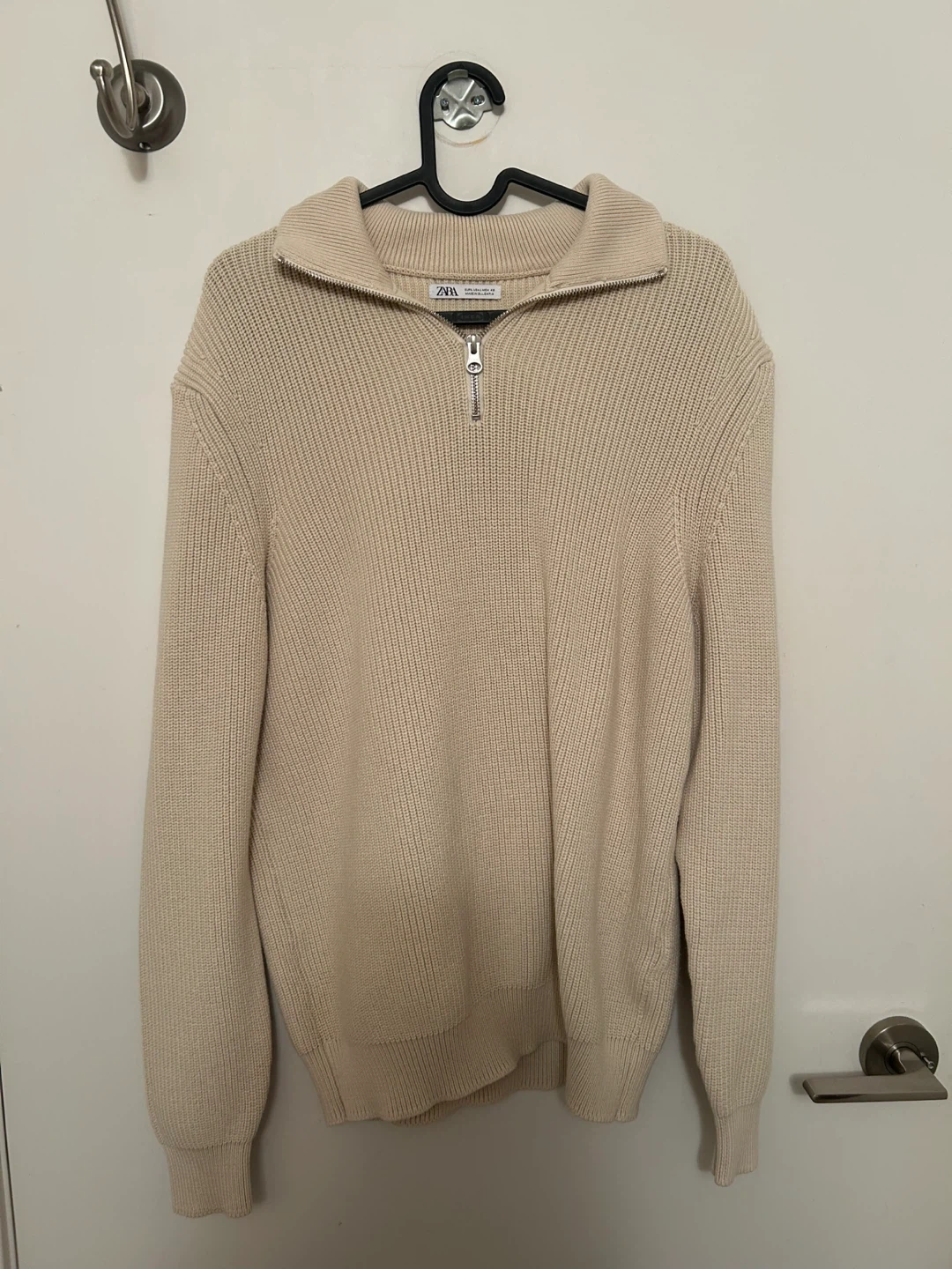 A beige knit sweater from ZARA with a half-zip closure and collar. Made in Bulgaria, size L. Cash preferred. Pick up only.