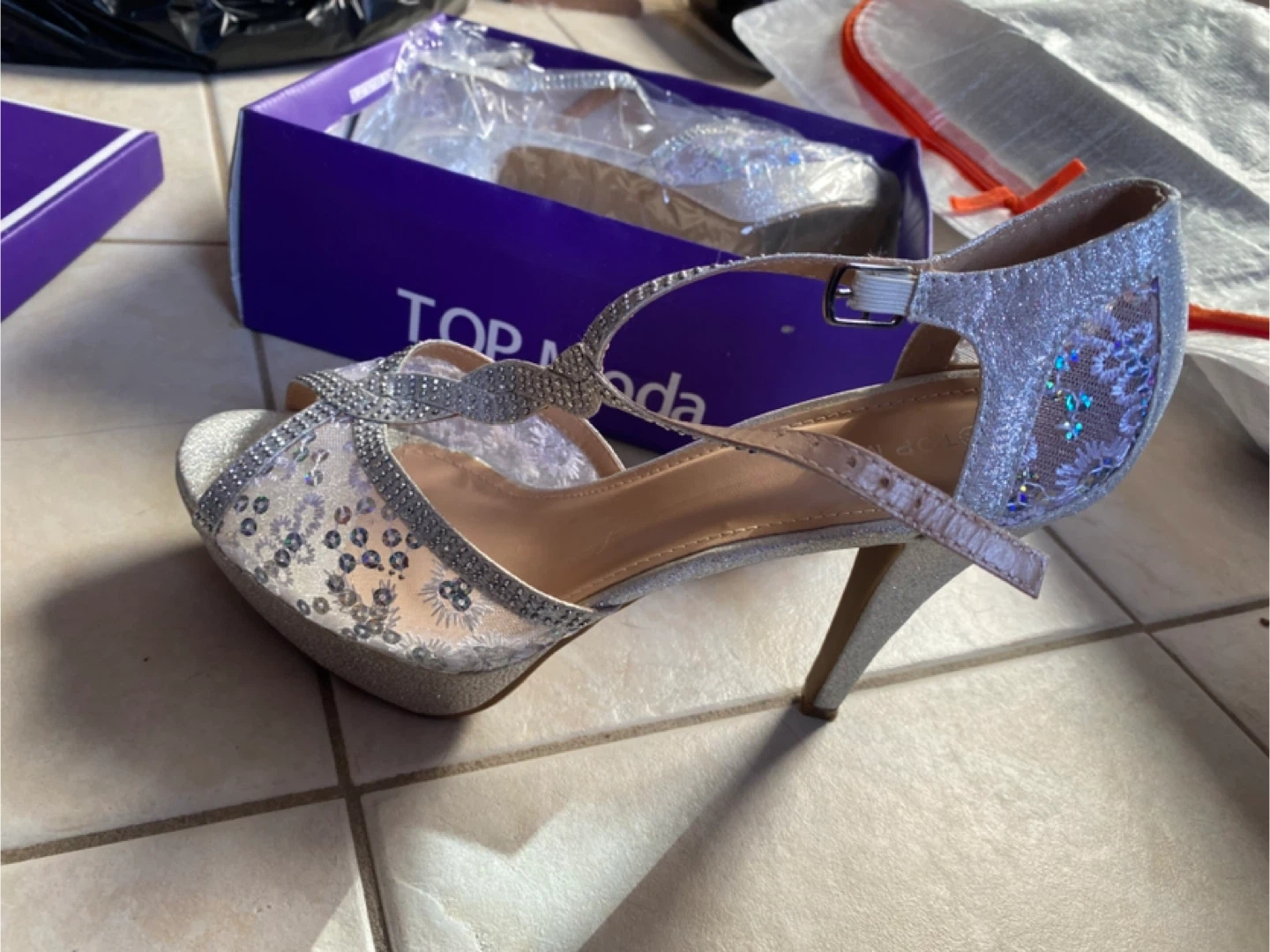 Selling a pair of Top Moda heels in silver, size 10. They come with the original box. Perfect for a night out or special occasion!