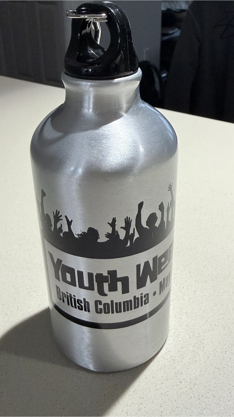 This is a reusable aluminum water bottle from Youth Week British Columbia. It's silver with a black lid and a carabiner clip for easy carrying. It's great for staying hydrated on the go!