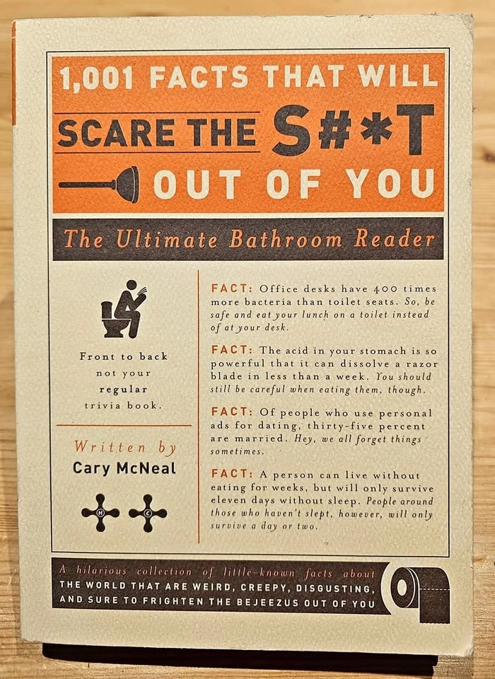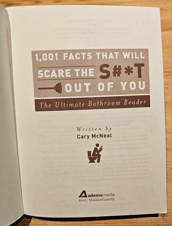 Soft cover copy of 1001 Facts that Will Scare the S#*t Out of You: The Ultimate Bathroom Reader by Carl McNeal. Adams Media, 2010. ISBN 13: 978-1-60550-624-1. This book has definitely not been read in a bathroom. Book, humour, humor, trivia.