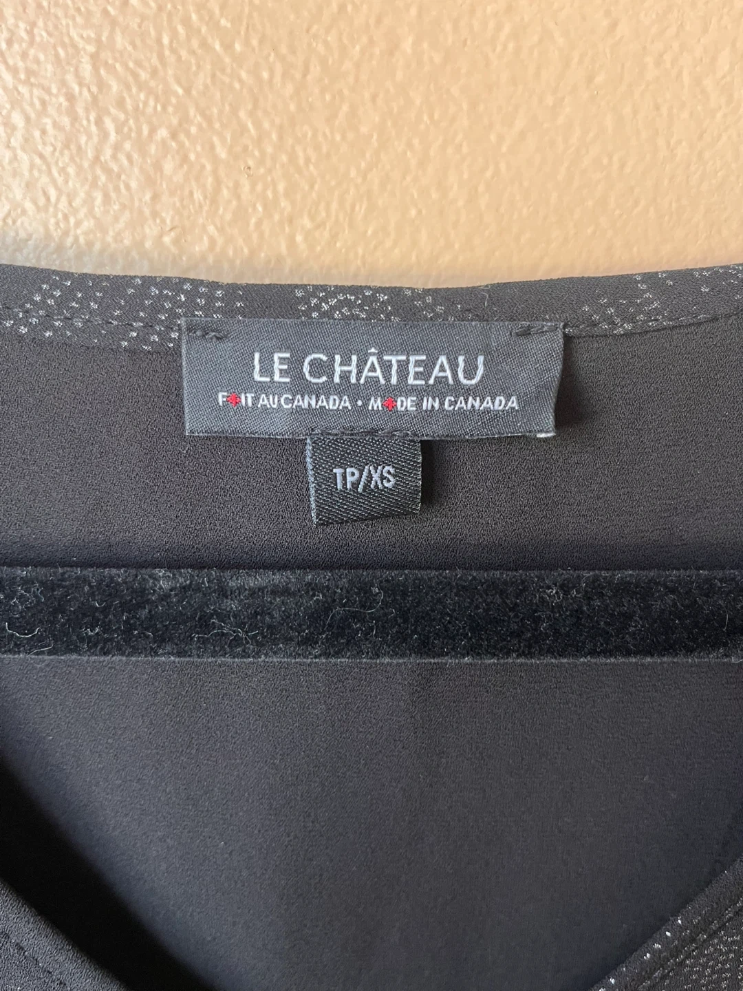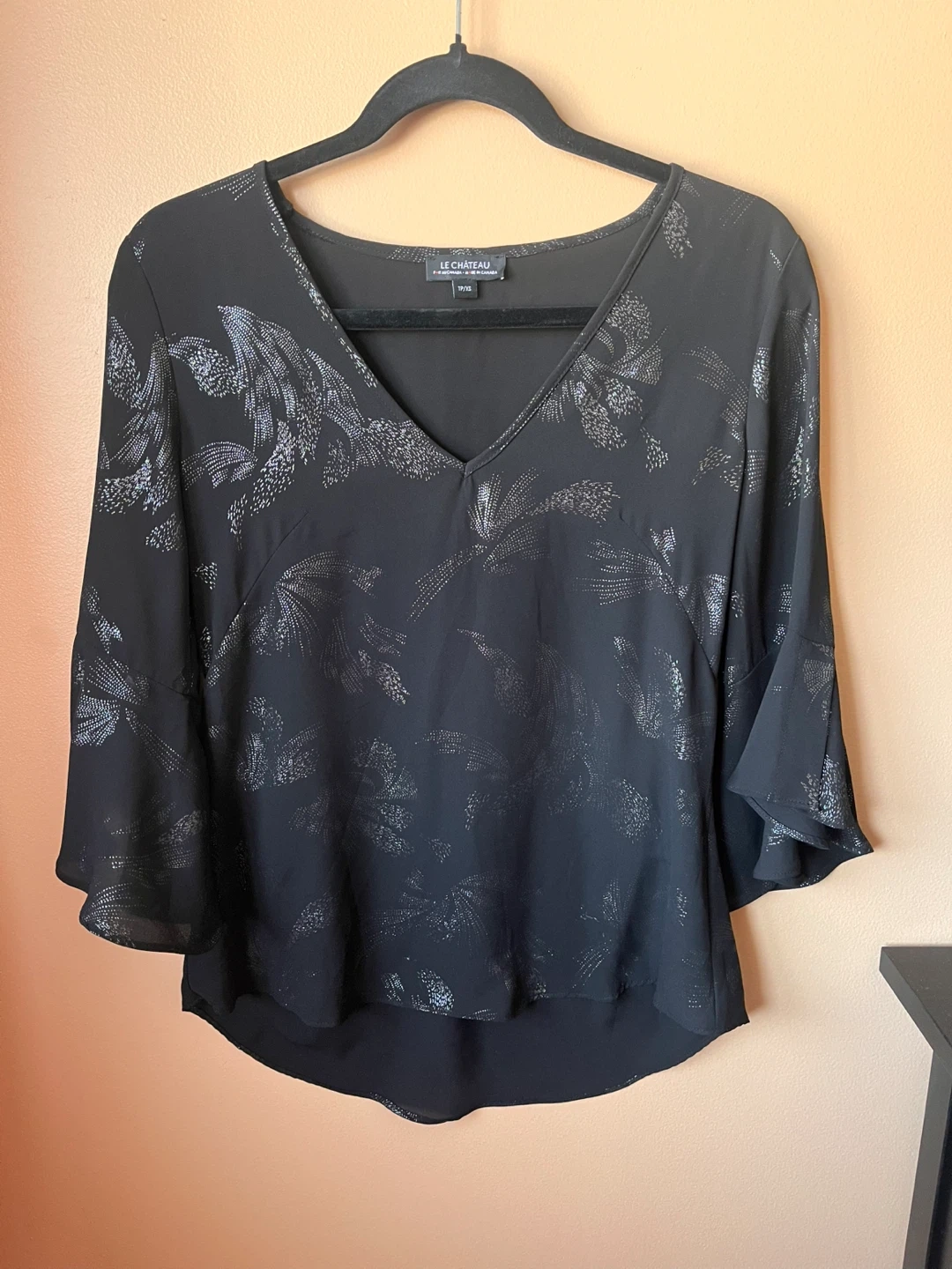 This LE CHÂTEAU blouse is black with a silver leaf-like pattern. It's made in Canada and features a V-neck with flutter sleeves. The size is XS. Like new