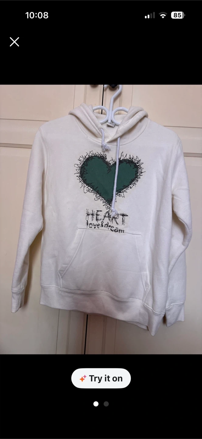 White hoodie with a unique green heart graphic and text that reads "HEART love&dream". It features a front kangaroo pocket and adjustable drawstring hood. Cotton blend material. Classic fit.